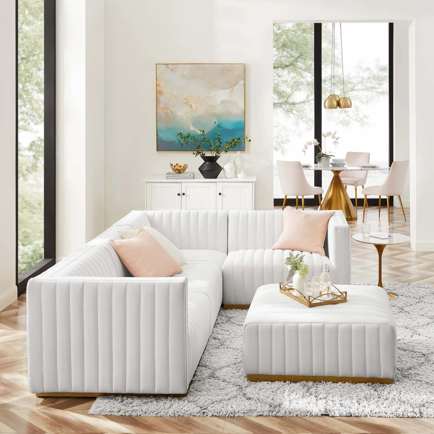 • Modern appeal surrounds the Conjure Channel Tufted Performance Velvet Upholstered 5-Piece Sectional Sofa. Luxuriously soft, stain-resistant performance velvet upholstery covers dense foam padding and an individually wrapped spring coil system for a supportive living room sofa that will become the go-to lounge spot for family and friends. Vertical channel tufting and subtle French piping adds depth to this vintage inspired sectional sofa that effortlessly becomes the focal point in your living room. Solidly constructed from wood and plywood, this sofa features non-marking foot caps and boasts a brushed gold stainless steel base. Versatile and elegant, this sectional sofa is ideally suited for a variety of decor styles in your living room, lounge, or home office. Each Seat Weight Capacity: 331 lbs.