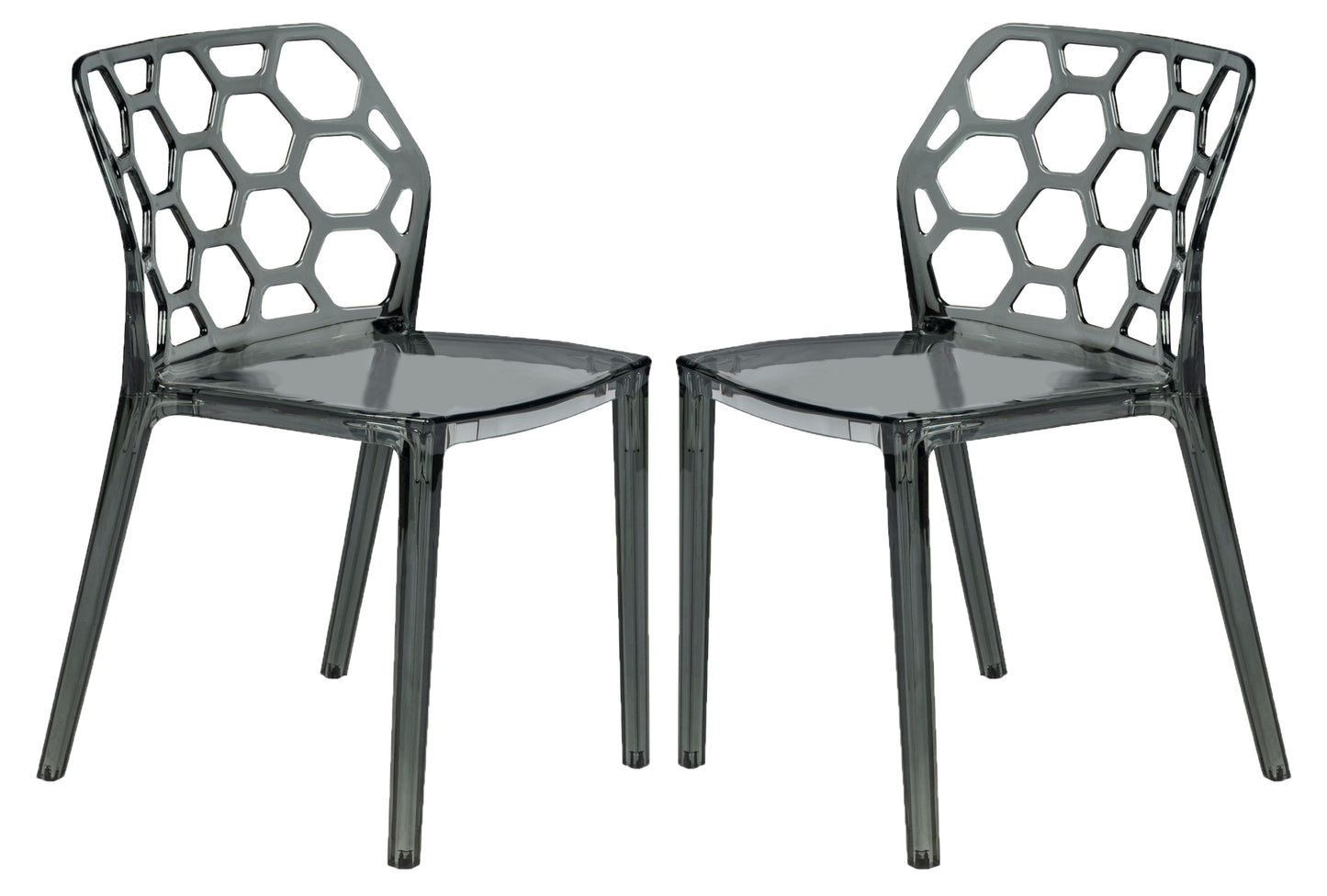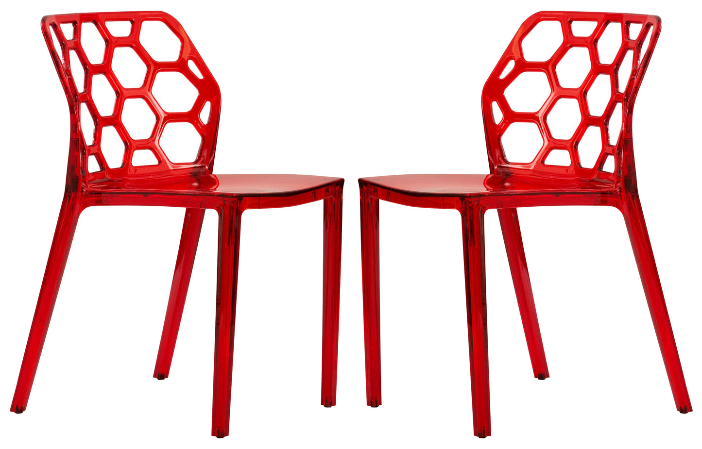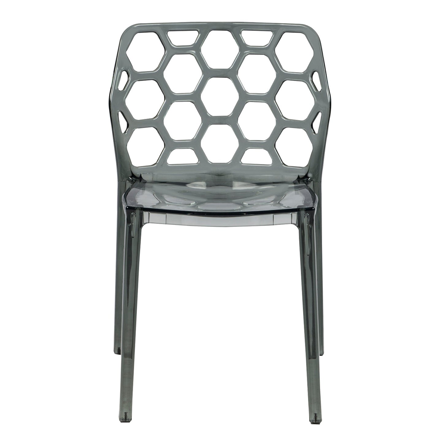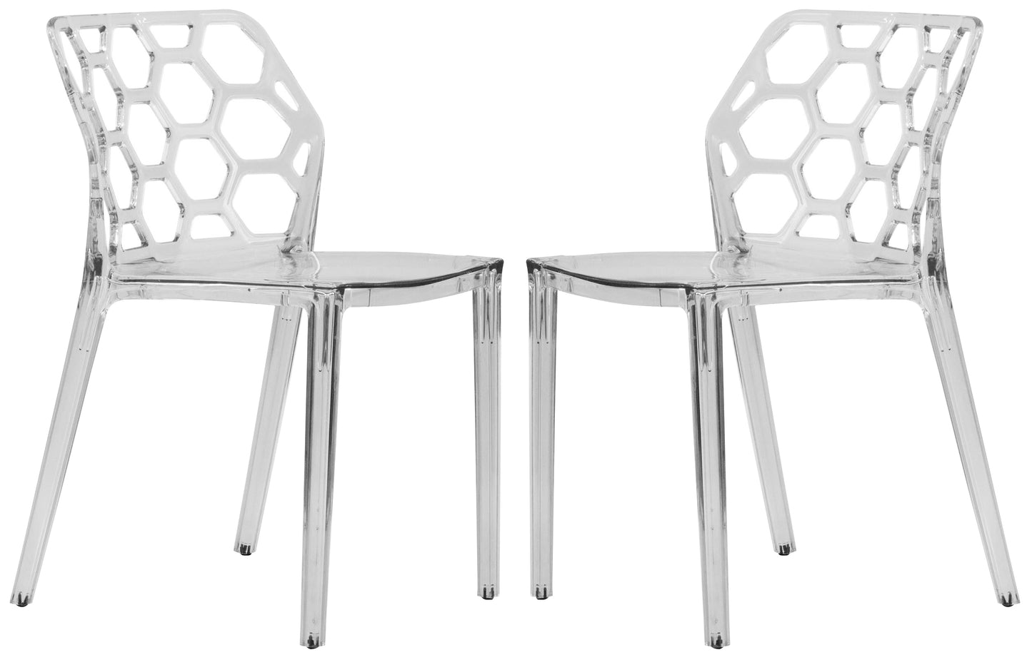 Bees and geometry love the shape of a hexagon - jump on the bandwagon and add the Dynamic Chair to your dining room, business or restaurant! This attractive organic shape makes a starring debut in contemporary design. These clear acrylic chairs are conveniently stackable, making them ideal for apartments, small spaces, or whenever easy storage is a priority. Because they are made from a single mold, the Dynamic Chairs are strong and durable. Each chair is complete with non-marking feet for floor protecting, with no assembly required.