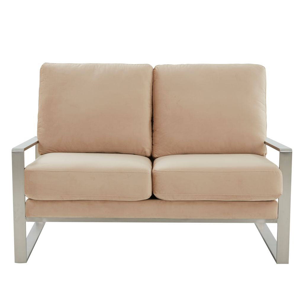 This stylish and contemporary modern Loveseat will be the perfect addition to your home. It features velvet upholstery in a versatile neutral color to match any décor and is supported by a sturdy silver metal frame and armrests. The loveseat is perfect for any living room, bedroom, or office, adding a touch of luxury and sophistication to any setting. The upholstery is soft and comfortable, and the generous seat size ensures plenty of room to sit back and relax. The silver metal frame and armrests add a chic and modern touch, while the velvet upholstery is easy to maintain and clean. Whether you're looking for a stylish addition to your living room, or a comfortable and chic spot to relax in your bedroom, this Loveseat is a perfect choice.