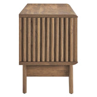 • Transform your living space with the Eudora TV Stand. Constructed with MDF and particleboard with a beautiful wood grain design, this entertainment console is both stylish and durable. The perfect addition to a living room, family room, or lounge area, this versatile piece serves its purpose as a modern TV stand with ample storage for media essentials and cable management holes. Vertical slatting on the hinged doors grants elegant definition to its overall look. With open and concealed shelving areas and full-glide drawers, this media center is designed for both storage and display. Bringing mid-century inspiration to the home, its splayed base and non-marking foot pads ensure stability and protect your floors from scratches. Assembly is required, but our easy-to-follow instructions make it a breeze. Weight Capacity: 200 lbs.