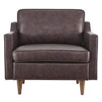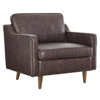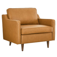 • Rejuvenate your living room or apartment decor with the Candice Genuine Leather Armchair. Smartly upholstered in durable, genuine top-grain leather with French piping detail, this modern armchair enlivens mid-century modern, eclectic, or minimalist living spaces. With a softened silhouette from the armrest sloping gently upward then leveling to join the sturdy backrest, the Candice Genuine Leather Armchair brings charisma and elegance to small-space living. A superior spring coil support system and dense foam padding provide enduring comfort in your living room, entryway, or lounge space. Carried robustly on four sturdy, round tapered, walnut-stained rubberwood legs with black foot caps, this comfortable reading chair adds distinction to your home office. Shipping in a portable box for easy maneuvering, the Candice Genuine Leather Armchair comes with easy-to-follow directions; a charming addition to a small-space living room or apartment. Armchair Weight Capacity: 331 lbs.