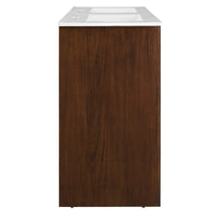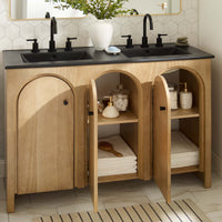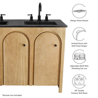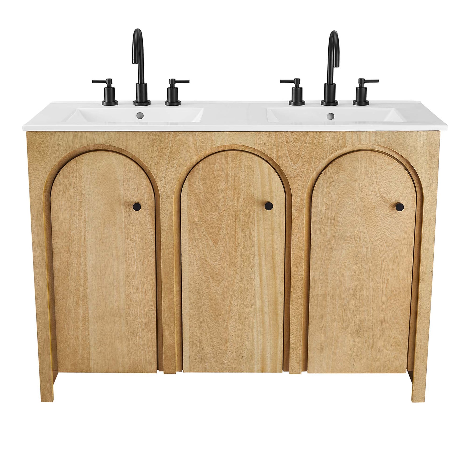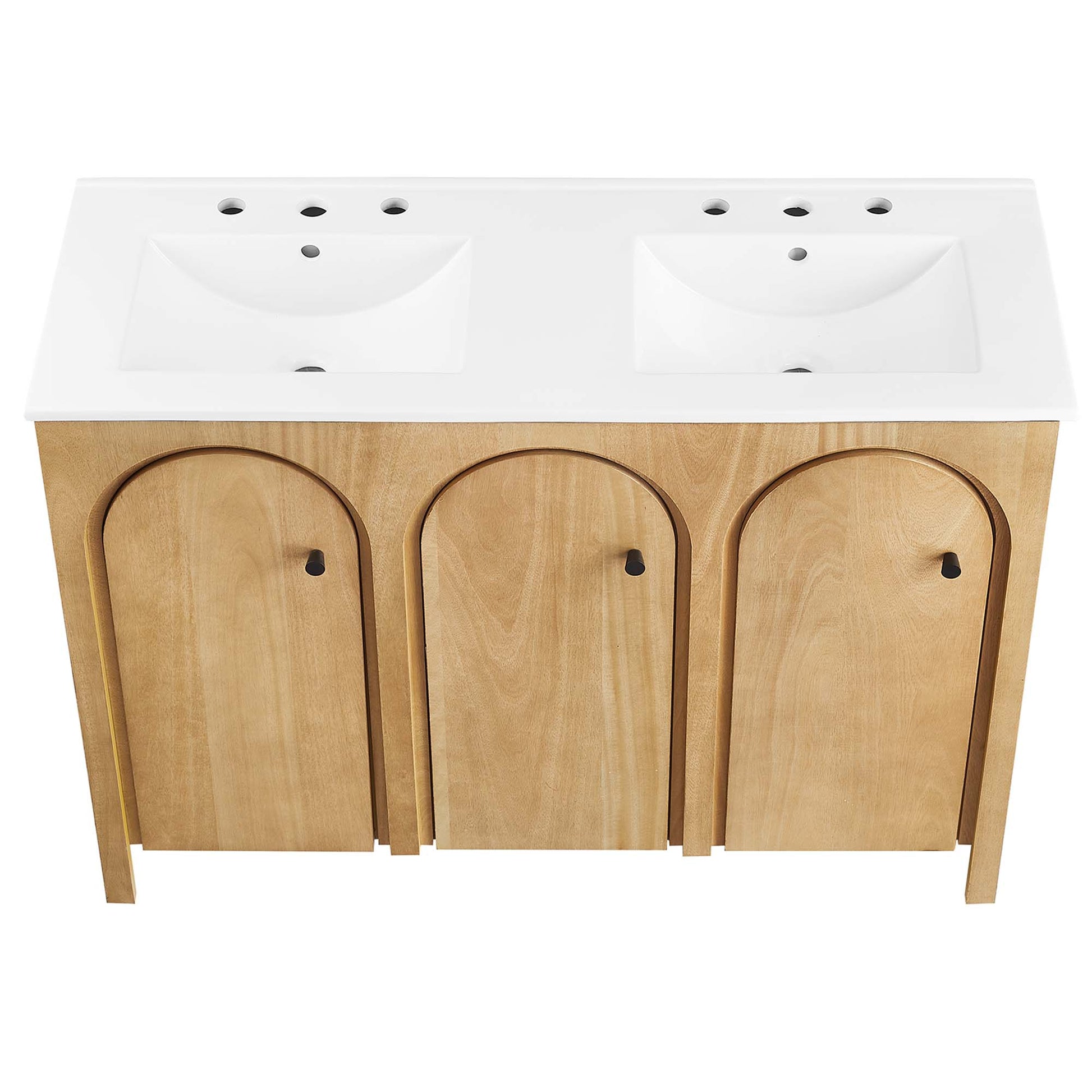 Elevate your bathroom's style with the Appia 48” Double Bathroom Vanity Cabinet, where retro elegance meets functionality. Expertly crafted from high-quality MDF and adorned with a mango wood veneer, this vanity cabinet brings stunning organic aesthetics to your bathroom furniture collection. Its three arched doors add beautiful dimension to any primary or guest bathroom. Featuring soft-close hinges, the Appia two sink vanity offers a smooth, quiet experience and includes adjustable shelves with convenient plumbing cut-outs, providing ample storage for all your vanity bathroom essentials. With its white double ceramic sink basin with 8" centerset holes and integrated countertop, this double sink vanity is a great choice for couples, and easily becomes a functional centerpiece in any bathroom. Assembly is straightforward, ensuring you can enjoy this stylish and modern vanity effortlessly. Includes adjustable non-marking foot pads to protect flooring. Fixtures not included.