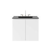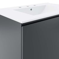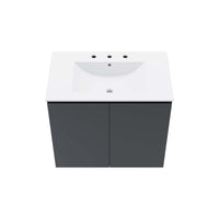The sleek look and clean-lined silhouette of the Bryn 30" Wall-Mount Bathroom Vanity add modern style to your bathroom space. Durably crafted with particleboard and melamine, this vanity mounts directly to the wall and features ample storage space under the sink behind two soft-close doors. Bryn features a cut-out design to accommodate plumbing. This vanity is complete with a ceramic sink basin with 8-inch centerset holes and an integrated countertop. Fixtures not included. Assembly required.