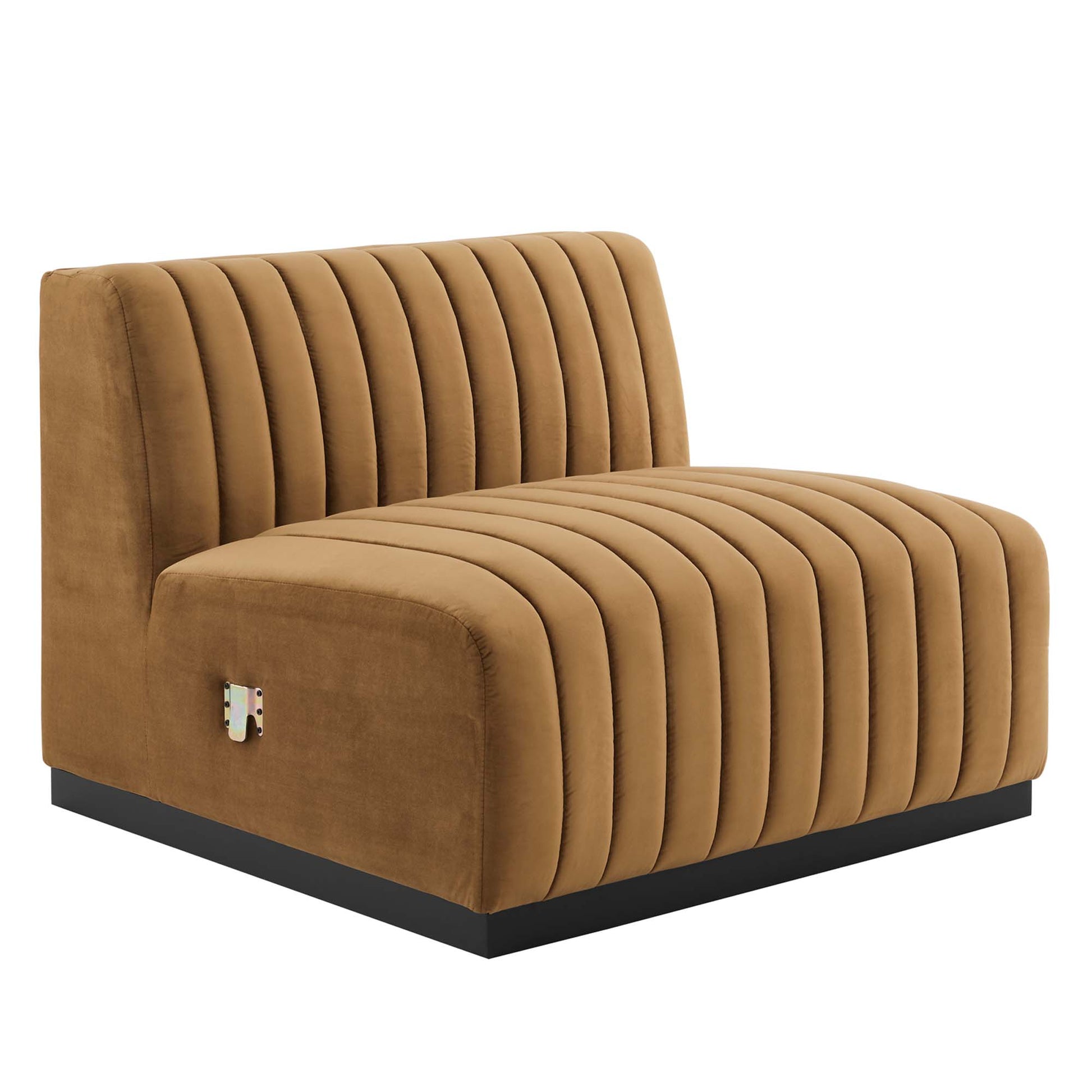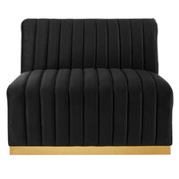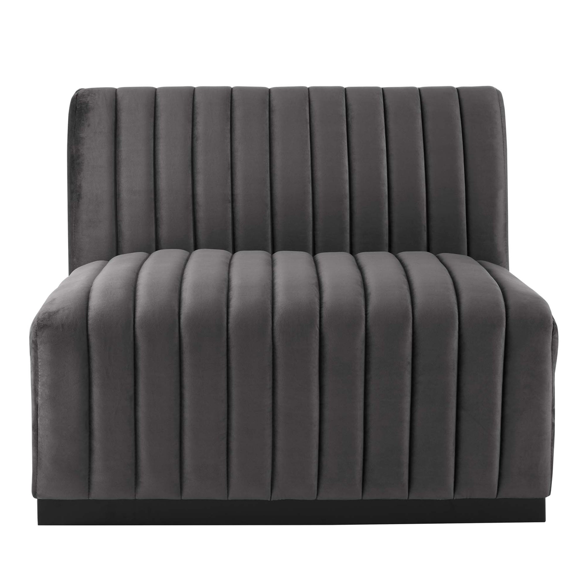 Modern appeal surrounds the Conjure Channel Tufted Performance Velvet Upholstered Armless Chair. Luxuriously soft, stain-resistant performance velvet upholstery covers dense foam padding and an individually wrapped spring coil system for a supportive living room chair that will become the go-to lounge spot for family and friends. Vertical channel tufting and subtle French piping adds depth to this vintage inspired sectional piece that effortlessly becomes the focal point in your living room. Solidly constructed from wood and plywood, this chair features non-marking foot caps and boasts a matte black base. Versatile and elegant, this sectional sofa piece is ideally suited for a variety of decor styles in your living room, lounge, or home office. Chair Weight Capacity: 331 lbs.