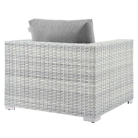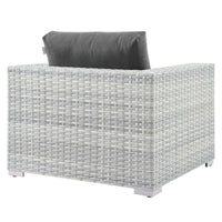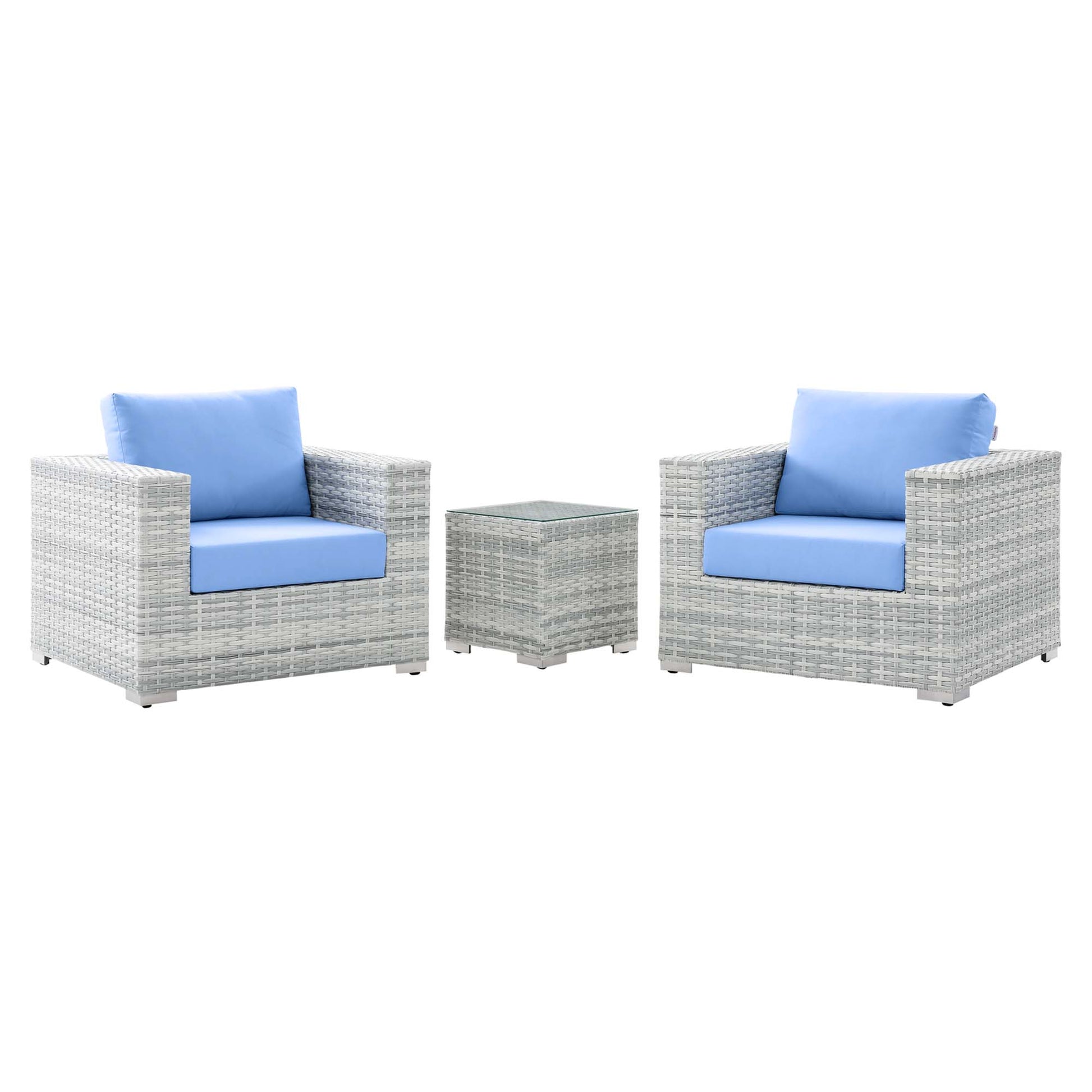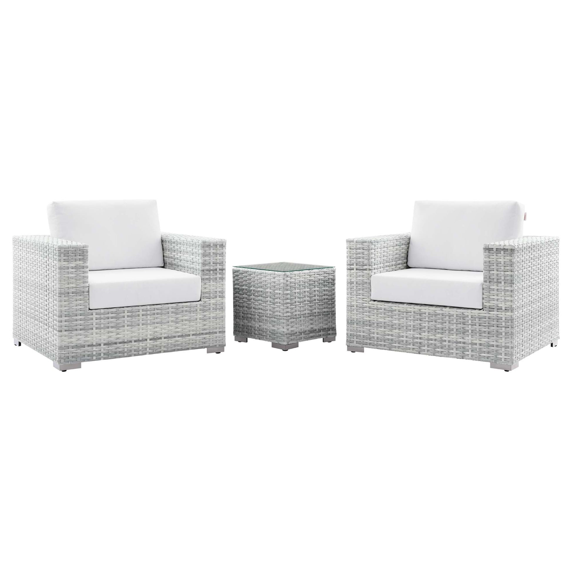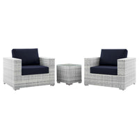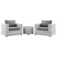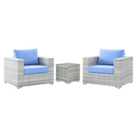 Gather stages of sensitivity with the Convene Outdoor Series. Made with a synthetic rattan weave and a powder-coated aluminum frame, Convene is a versatile outdoor furniture set that shifts and combines according to the spontaneous needs of the moment. Outfitted with all-weather fabric cushions, the Convene Sectional Set leaves a positive impression on friends and family while enhancing your patio, backyard, or poolside retreat with palpable distinction. This outdoor patio furniture set includes two armchairs and a side table.