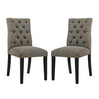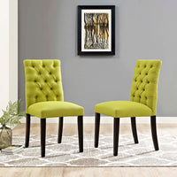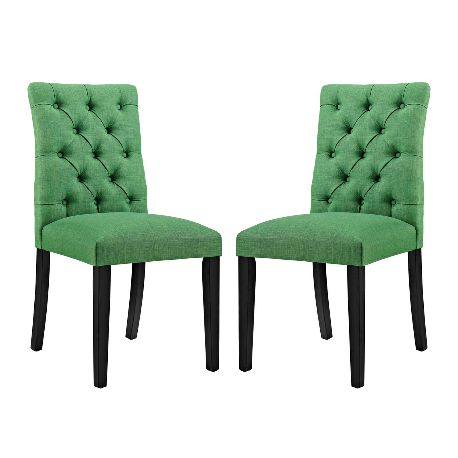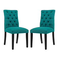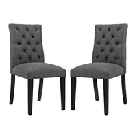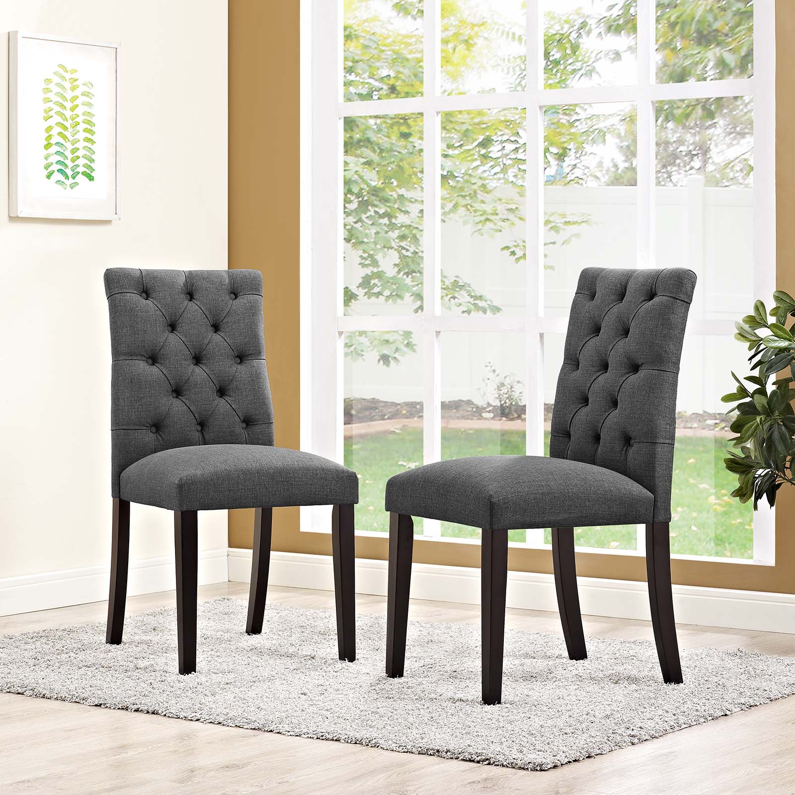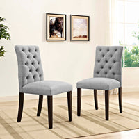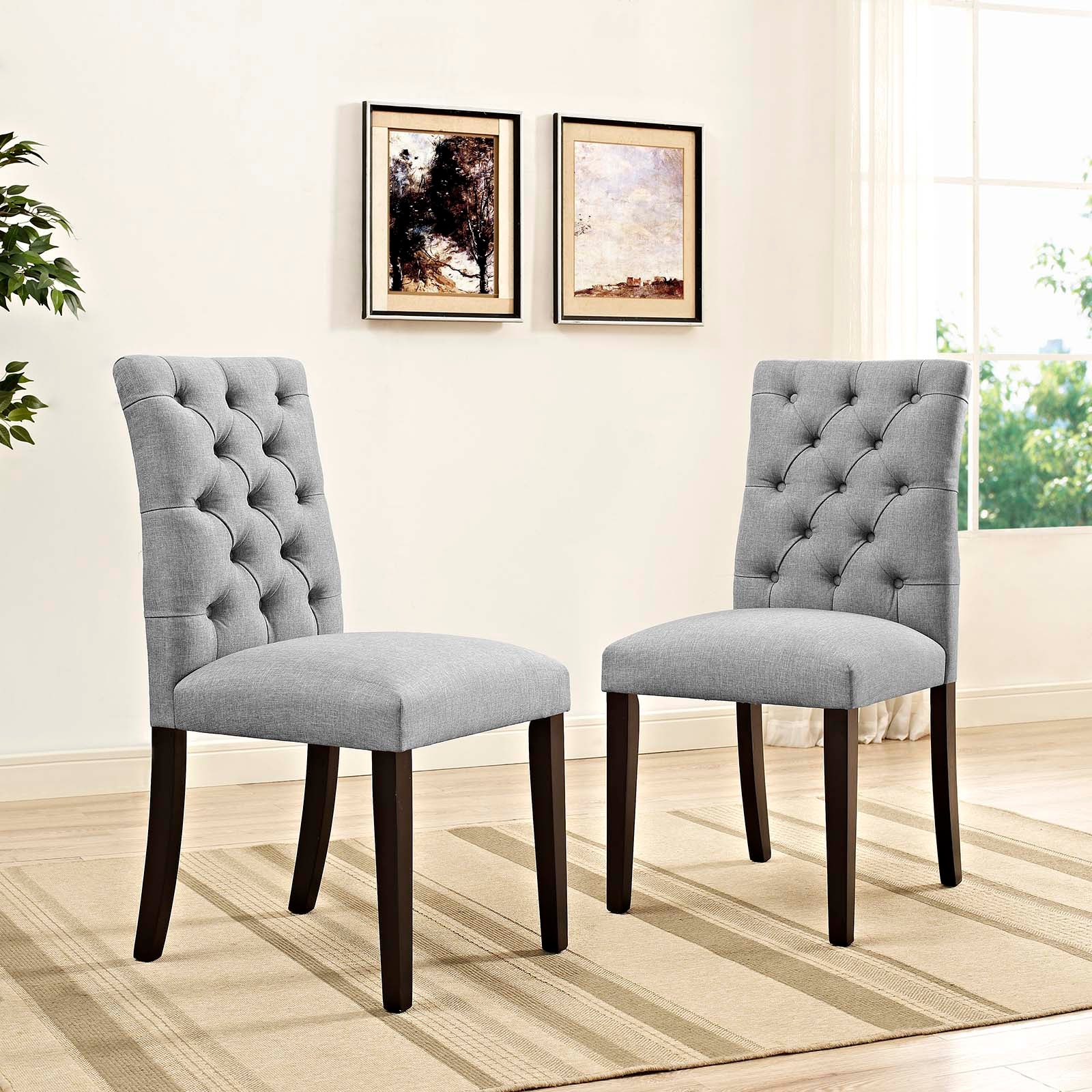 Bestow elegance with the Duchess Dining Chair. Chic and luxurious, Duchess features a stylish curvy form, richly tufted button back, dense foam padding, fine fabric upholstery, and wood legs topped with non-marking foot caps. Resonate grace and charm with a dining chair perfect for the modern home.