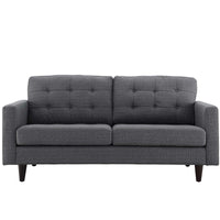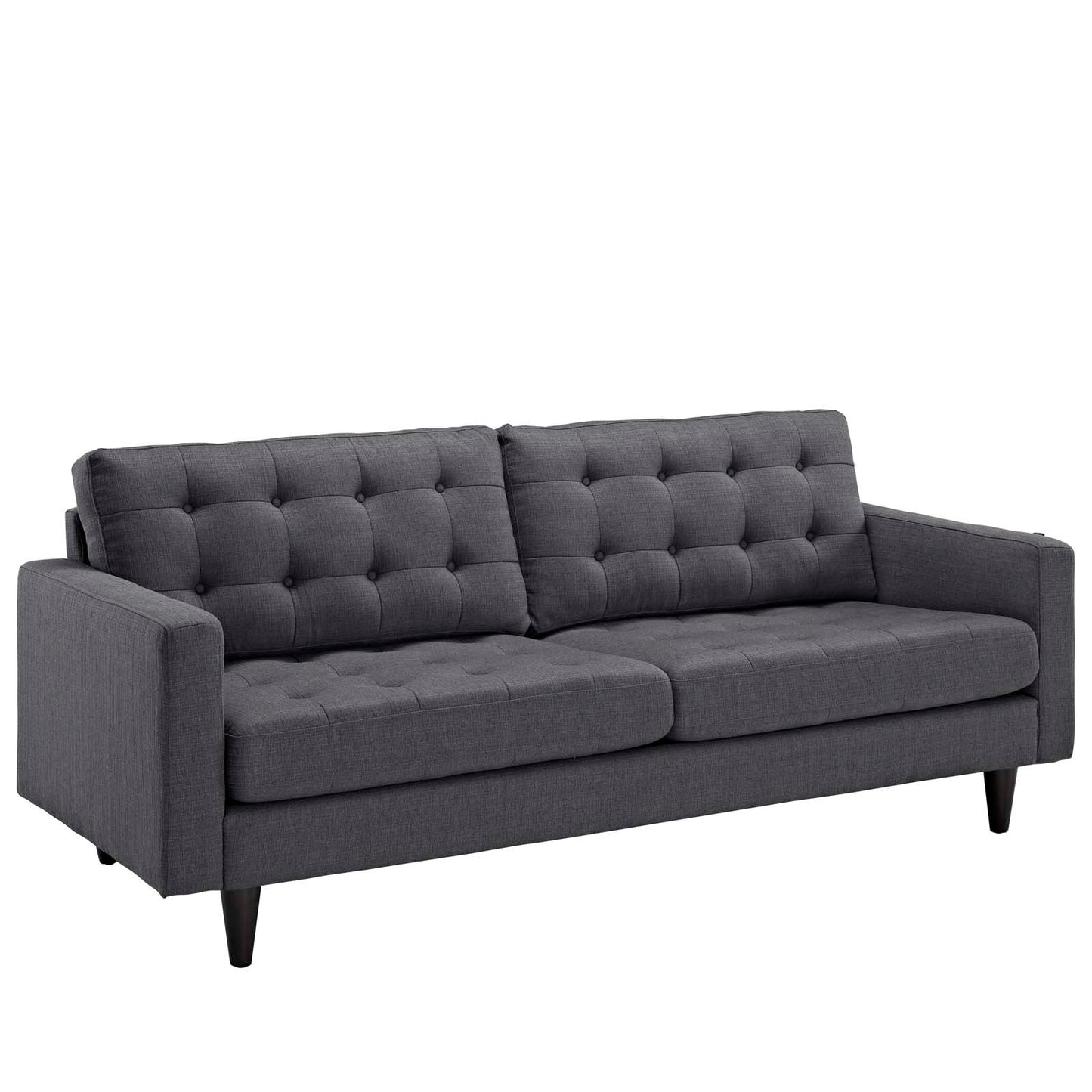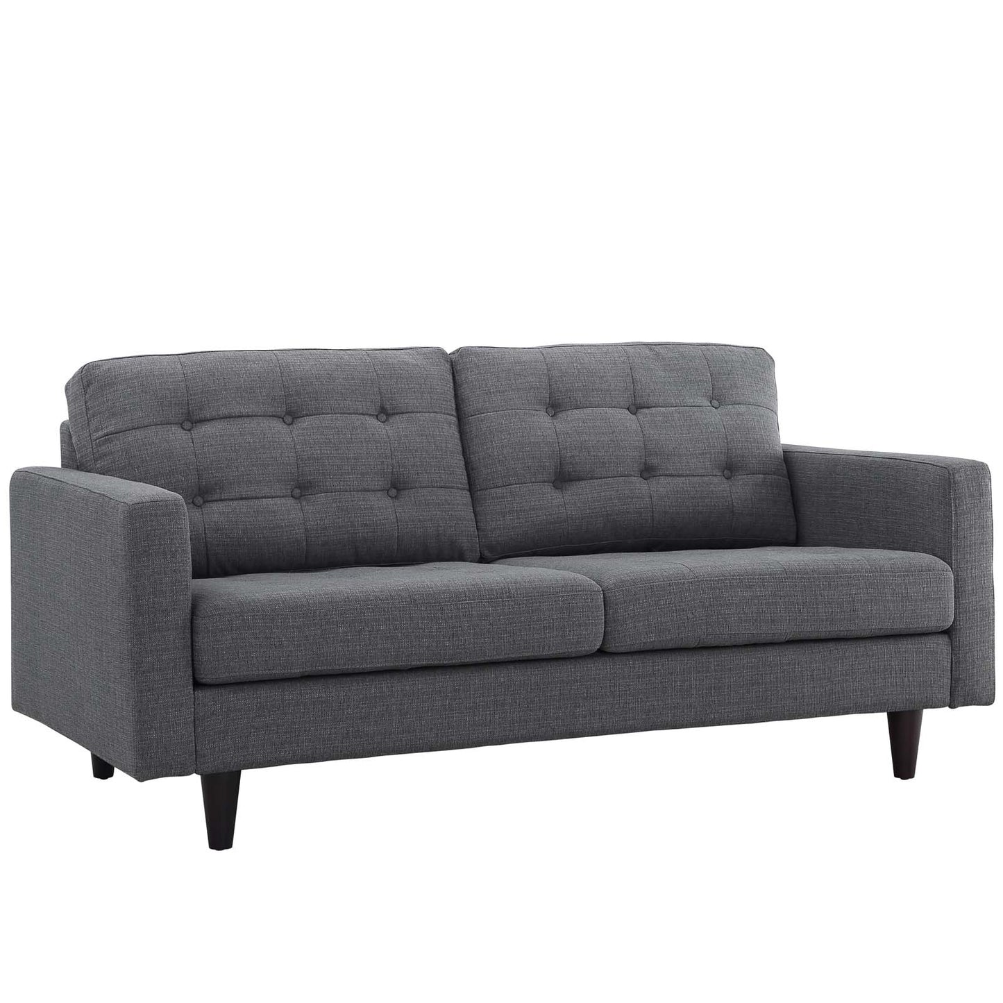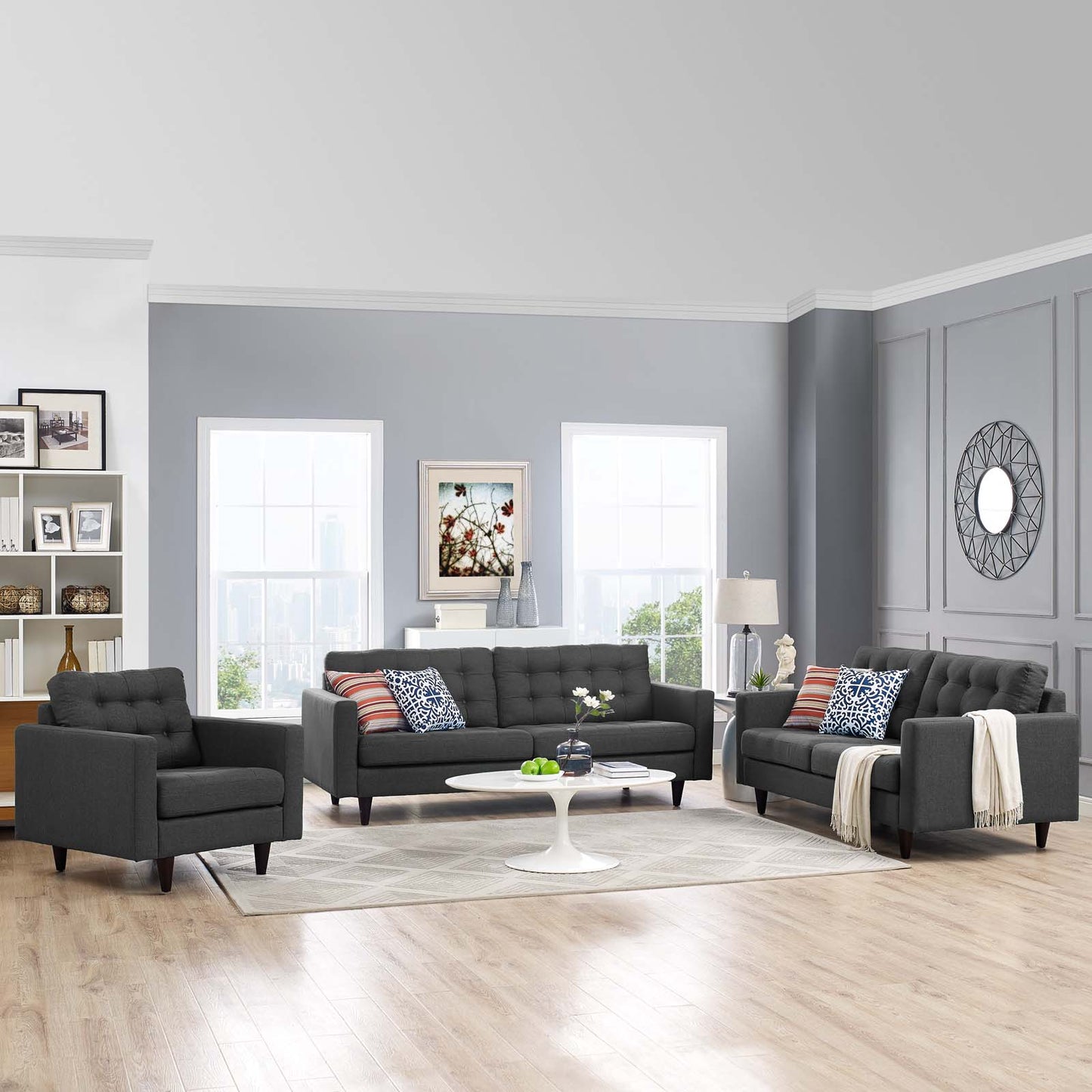 End the rule of unjust sovereignties that wage a useless war for your interiors. Empress Button Tufted Upholstered Fabric Sectional Sofa Set leaves the would-be heiress of holistic furnishings in the dust with a design that rivals any competitor. Empress is a 3 piece loveseat and armchair set heralded with deeply tufted buttons, plush cushions, and armrests that convey that perfect air of nobility. The solid wood legs come with plastic glides to prevent floor scratching, and support the solidly constructed wood frame of this sectional sofa set. Dense foam padding create a luxe seating experience while the durable and stain-resistant fine fabric upholstery leaves the recipients feeling richly rewarded.