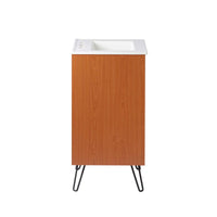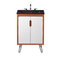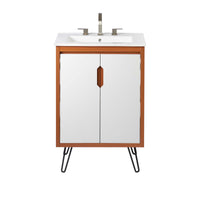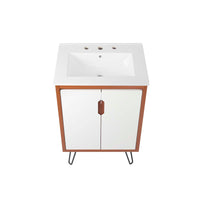 Instill mid-century modern energy in your bathroom decor with the Energize 24" Bathroom Vanity. Resting on four metal hairpin legs, this bathroom vanity cabinet features a durable particleboard and MDF construction and a ceramic sink basin with 8-inch centerset holes and an integrated countertop. Behind two soft-close doors with cutaway designs for easy open and close functionality is a spacious storage area to keep all your bathroom essentials organized and concealed. The sleek look aligns with Scandinavian modern style for a dynamic vanity designed for a multitude of decor styles from modern to contemporary. Fixtures not included. Assembly required.
