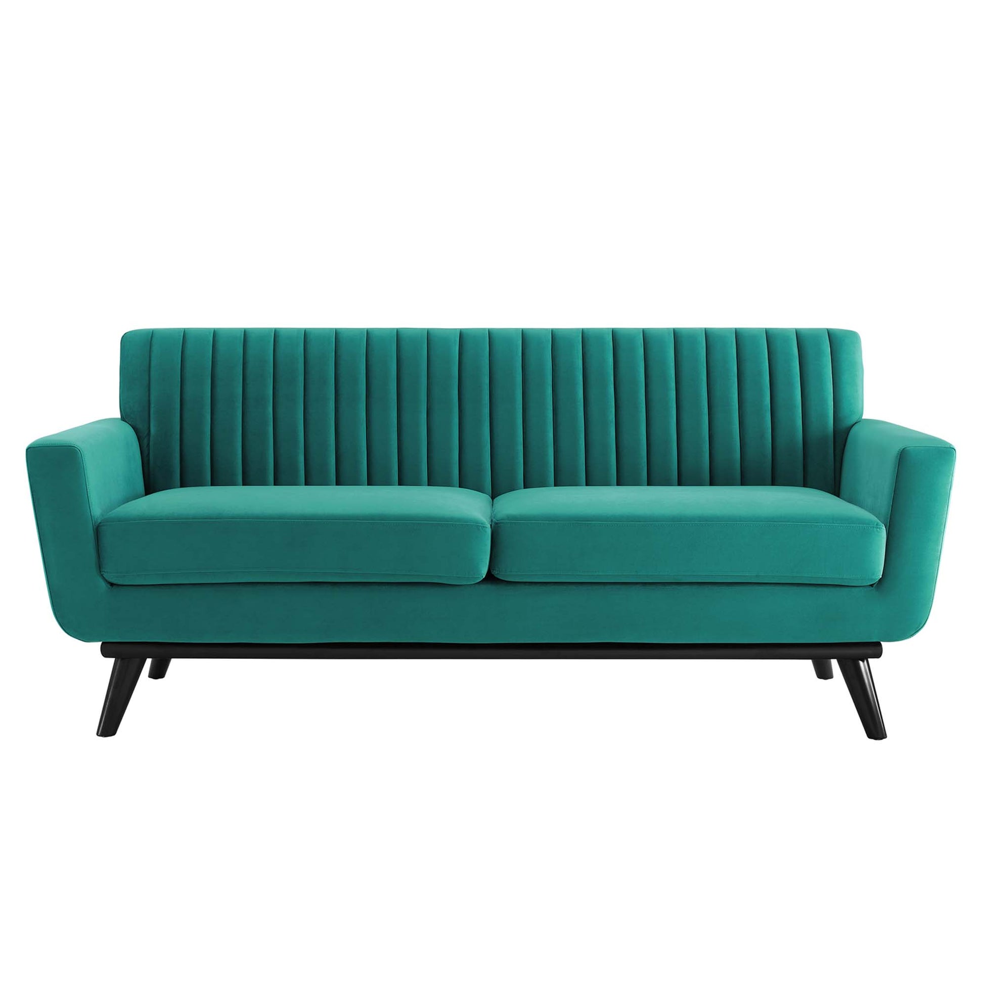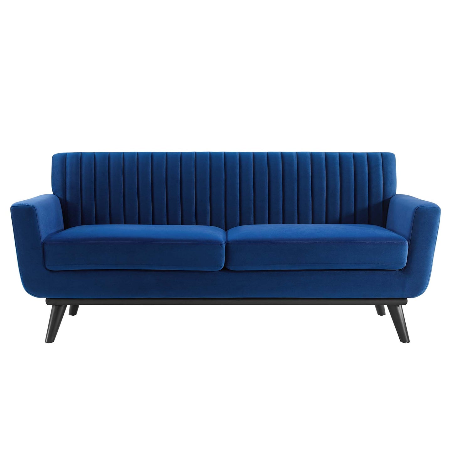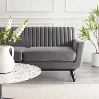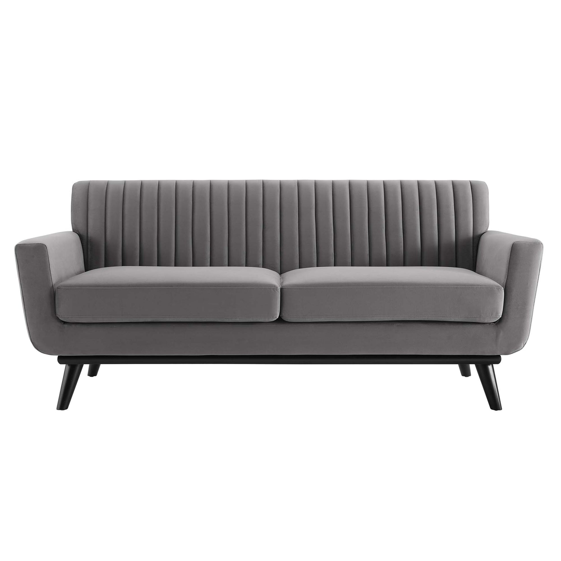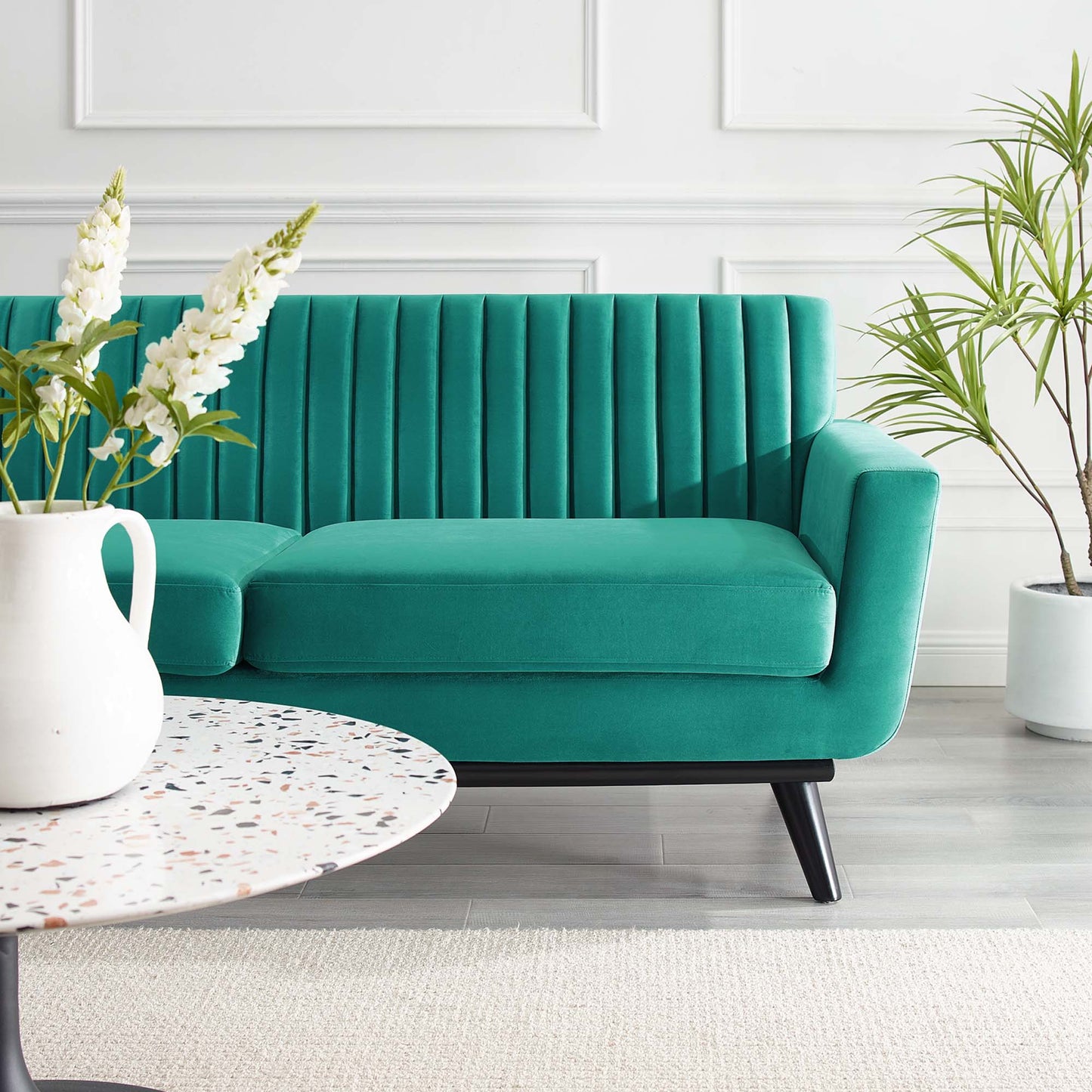 Gently sloping curves and plush seat cushion create a favorite lounging spot. Whether relaxing after a long day at work, settling in with coffee and brunch, or entering a spirited discussion with friends, the Engage Loveseat is a welcome presence in your home. Channel tufting creates eye-catching appeal, adding depth that brings your sitting décor to center stage. The black painted rubberwood legs and frame offer a solid base for the stain-resistant performance velvet upholstery.