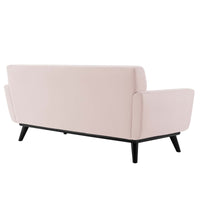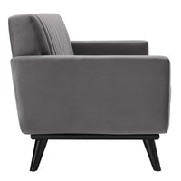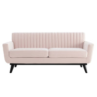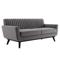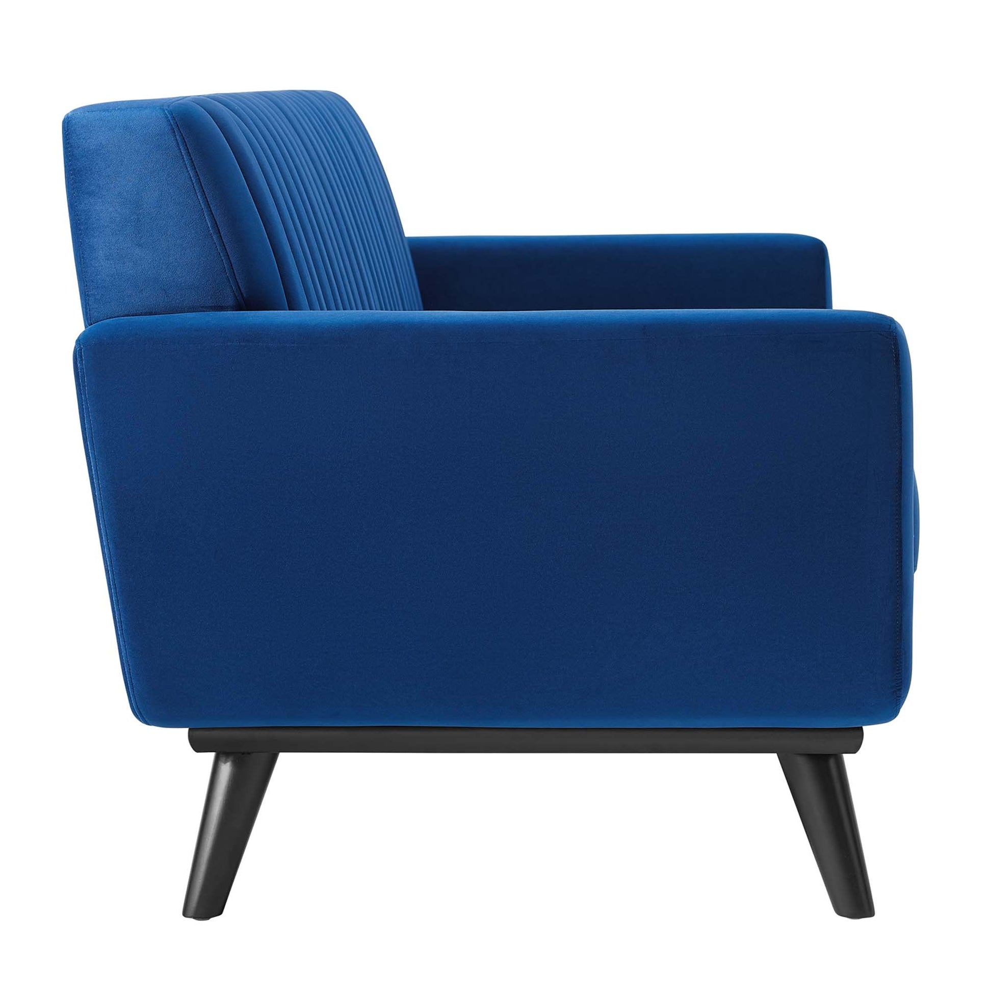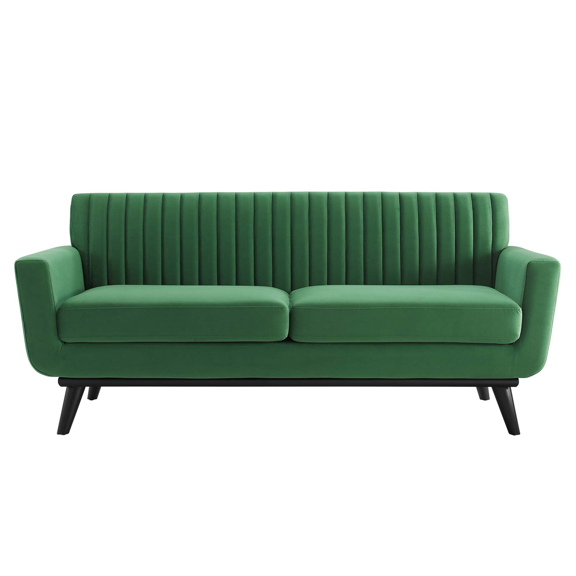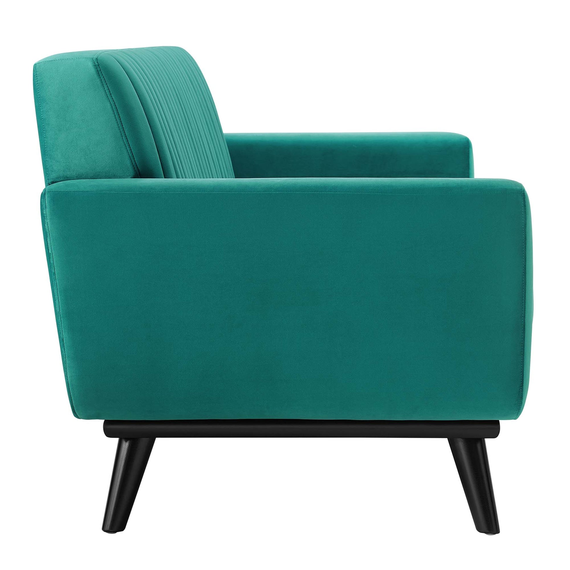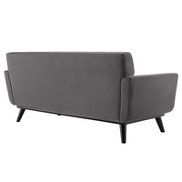 Gently sloping curves and plush seat cushion create a favorite lounging spot. Whether relaxing after a long day at work, settling in with coffee and brunch, or entering a spirited discussion with friends, the Engage Loveseat is a welcome presence in your home. Channel tufting creates eye-catching appeal, adding depth that brings your sitting décor to center stage. The black painted rubberwood legs and frame offer a solid base for the stain-resistant performance velvet upholstery.