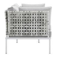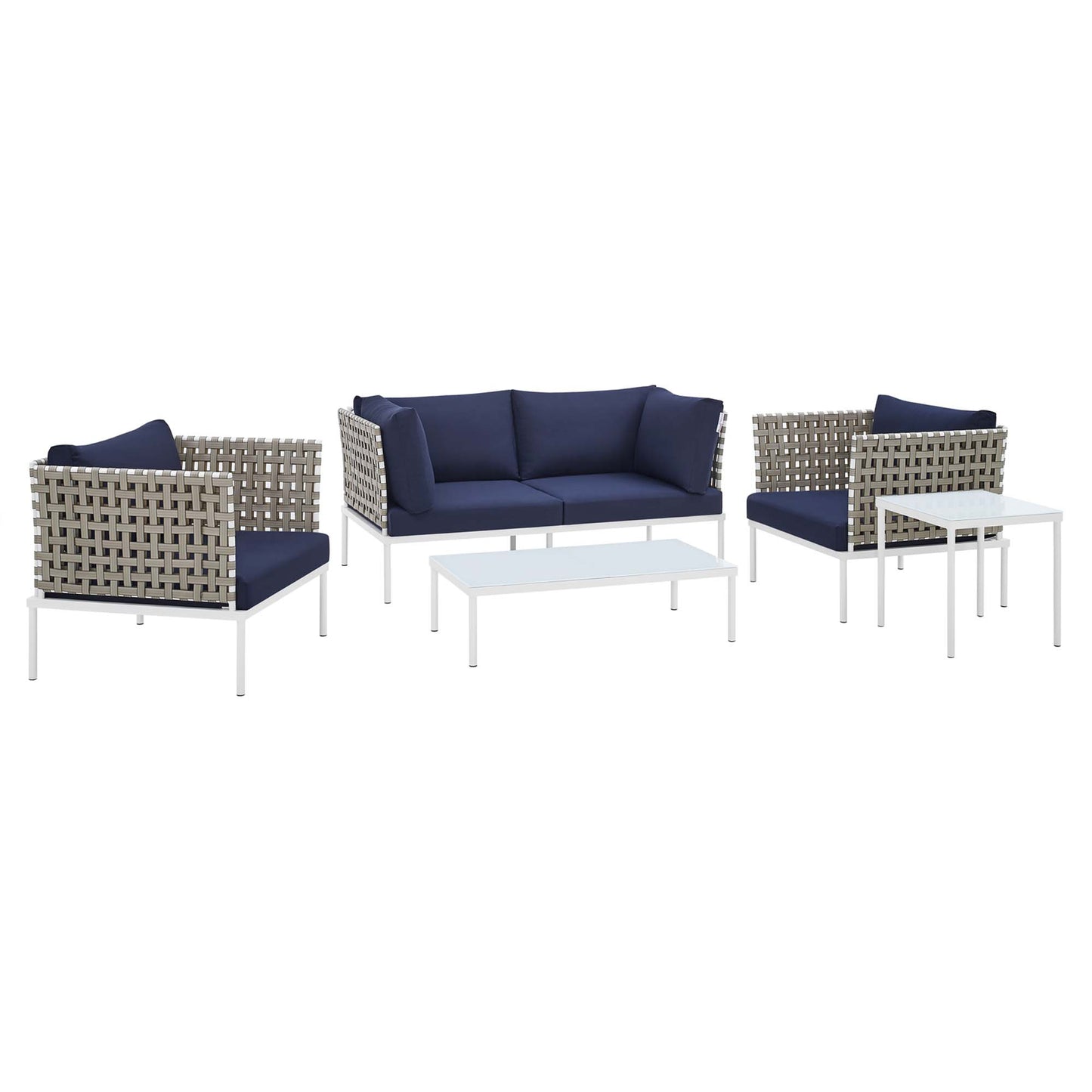 Engage life with Harmony. Enjoy casual conversation under the open sky with an all-weather waterproof furniture set that delivers an exceptional outdoor porch, patio, balcony or garden experience. An exceptional modern furniture set that exceeds expectations, Harmony comes with long-lasting machine washable Sunbrella® fabric cushions, synthetic rattan seat back weave, square powder coated aluminum bases, tempered glass top tables, and non-marking foot caps. A sectional that arranges according to the spontaneous needs of your guests, set your sights on open and inspired moments with the Harmony Outdoor Patio Collection. Set Includes: 1 Loveseat, 2 Armchairs, 1 Coffee Table, 1 Side Table
