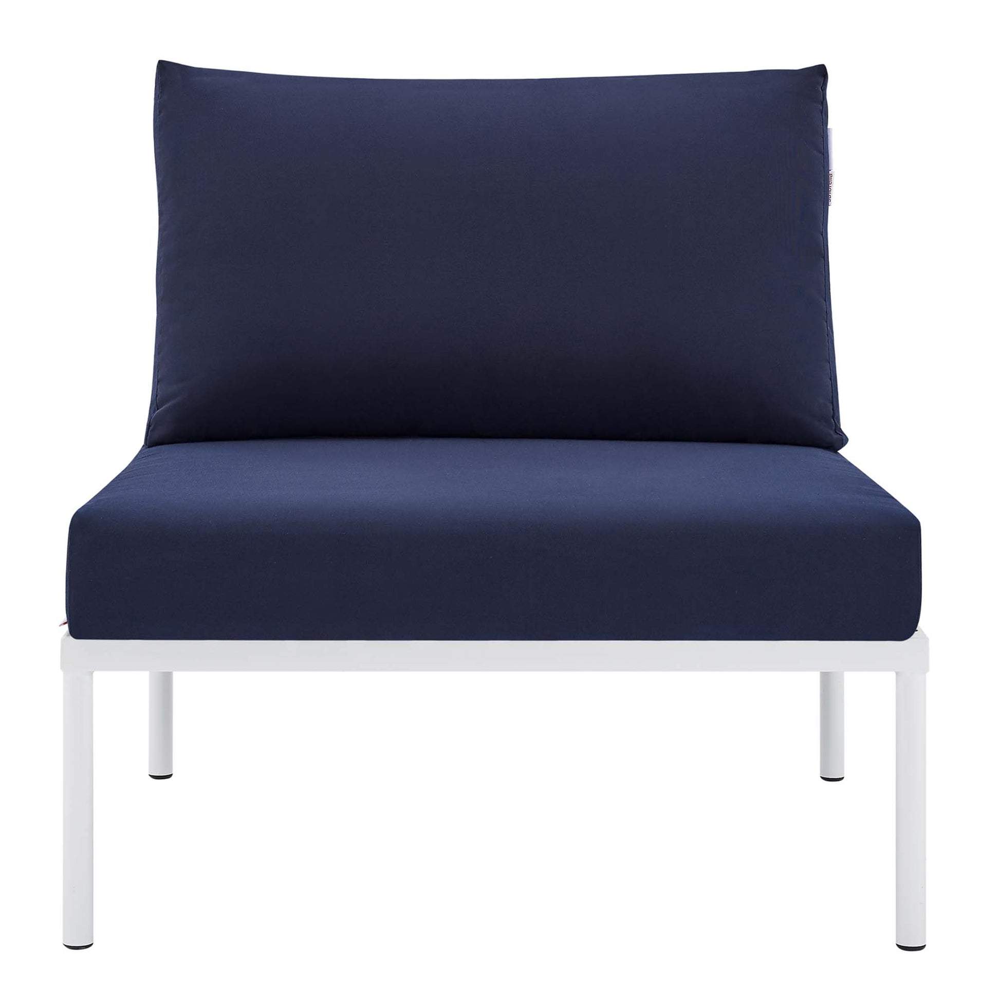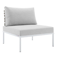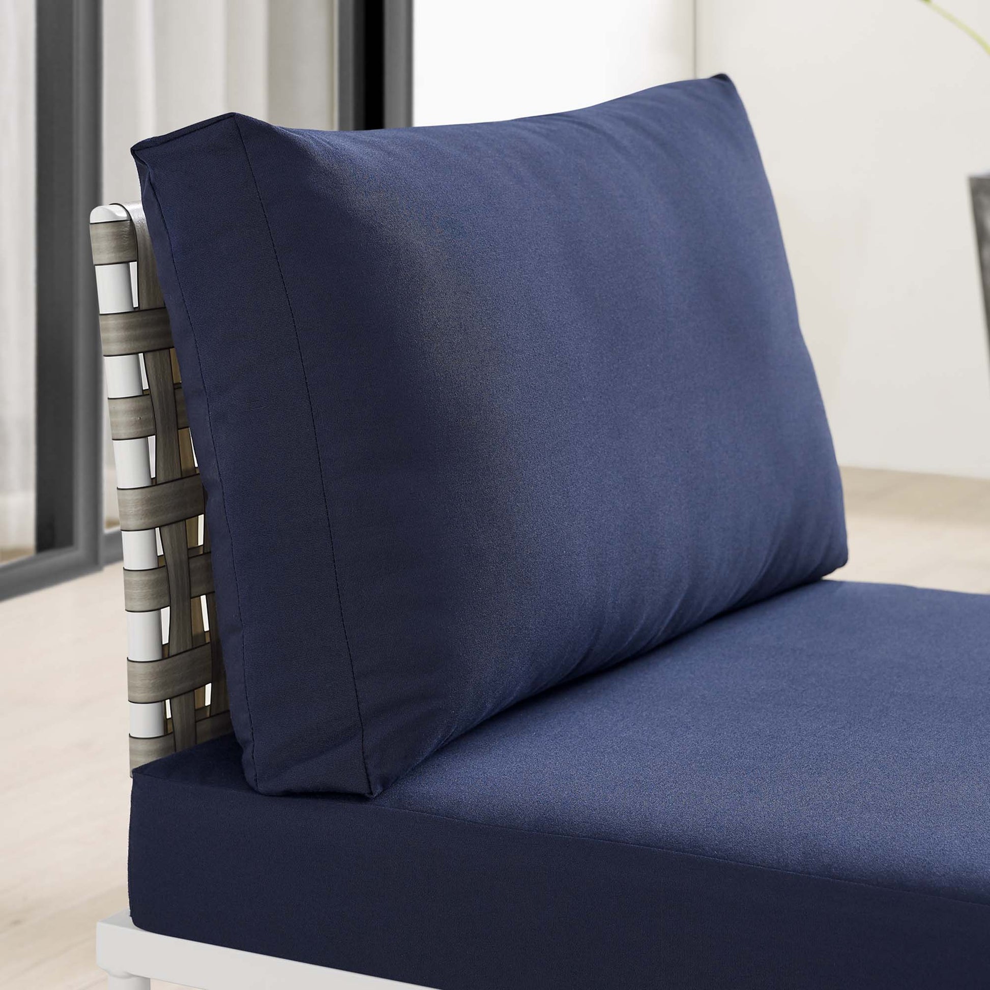 Engage life with Harmony Outdoor Patio Armless Chair. Enjoy casual conversation under the open sky with an all-weather waterproof outdoor chair from a versatile furniture set that delivers an exceptional outdoor porch, patio, balcony or garden experience. An exceptional modern outdoor furniture set that exceeds expectations, Harmony Patio Armless Chair comes with synthetic rattan seat back weave, square powder coated aluminum bases, Sunbrella® cushions, and non-marking foot caps. An outside sectional armless chair that arranges according to the spontaneous needs of your guests, set your sights on open and inspired moments with the Harmony Outdoor Patio Collection.