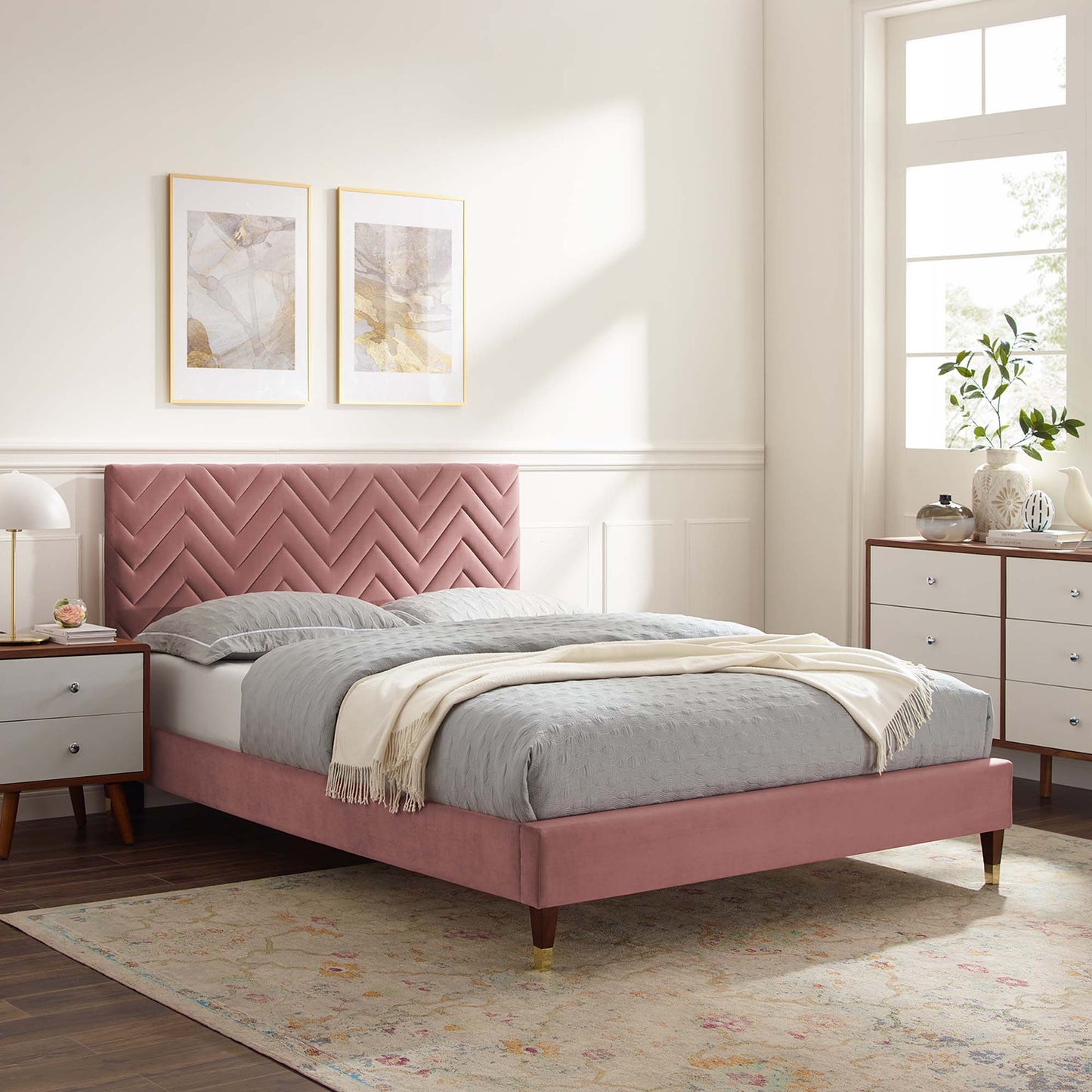 Introduce contemporary elegance into your child's bedroom or guest room with the Leah Chevron Tufted Performance Velvet Twin Platform Bed. The upholstered headboard boasts a glam deco zigzag design and dense foam padding for luxe comfort. Tailored in stain-resistant performance velvet, this twin bed complements mid-century modern or eclectic decors. With a sturdy MDF frame, the Leah Twin Platform Bed is a lasting foundation for memory foam, innerspring, latex, and hybrid mattresses. The well-crafted poplar wood slat support system eliminates the need for a box spring, ensuring durability and firm support. This twin platform bed rests on gold metal legs with non-marking foot caps. Assembly required. Weight Capacity: 800 lbs.
