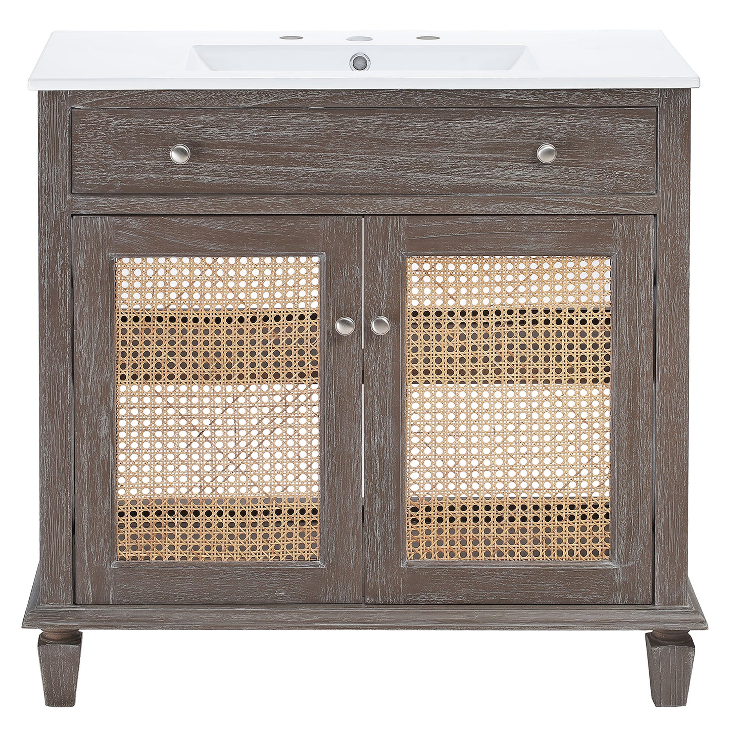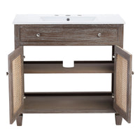 Encompassing the coastal aesthetics of tropical design, the Lilo 36" Bathroom Vanity effortlessly updates a bathroom space. Durably constructed with solid mindi wood, this vanity features a faux top drawer and two soft-close hinged doors adorned with natural rattan cane detail. Behind the two closed doors is an adjustable shelf and ample storage space to keep visual space clean and your bathroom essentials organized. This wood vanity features a ceramic sink basin with 8-inch centerset holes and an integrated countertop aligning style and function. Includes non-marking foot caps. Assembly required. Fixtures not included.