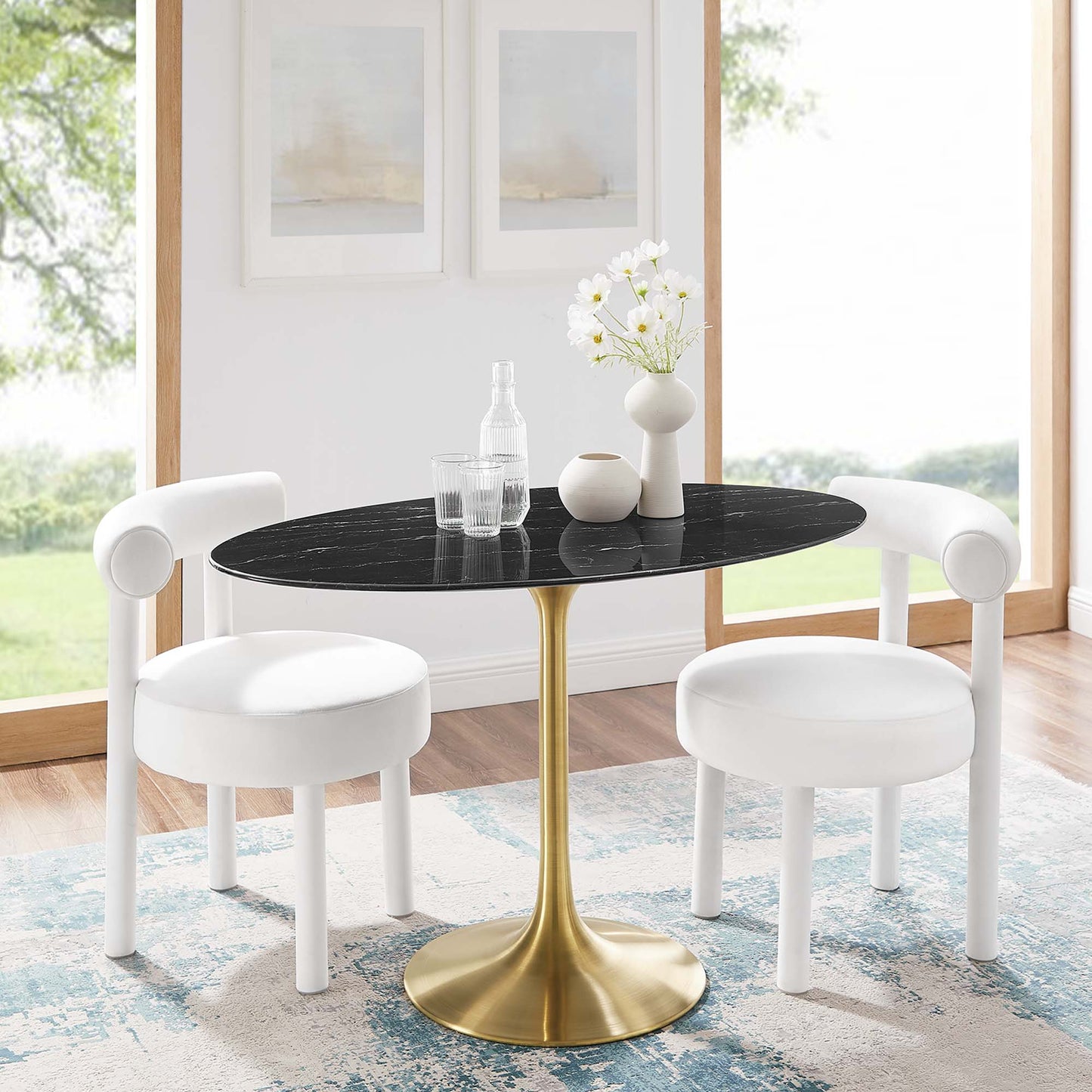 Reflecting a seamless organic shape and timeless form, the Lippa dining table has become a symbol of modernism for over the past 60 years. Before its release, homes were filled with clunky remnants of an industrial age long gone by. But in order to advance into the new world, homes first had to transition from the traditional square table, into a piece that connoted progress. The base and dimensions are true to the original specifications, while the table’s oval-shaped artificial marble top, and tapered metal base, are carefully lacquered with a durable finish.