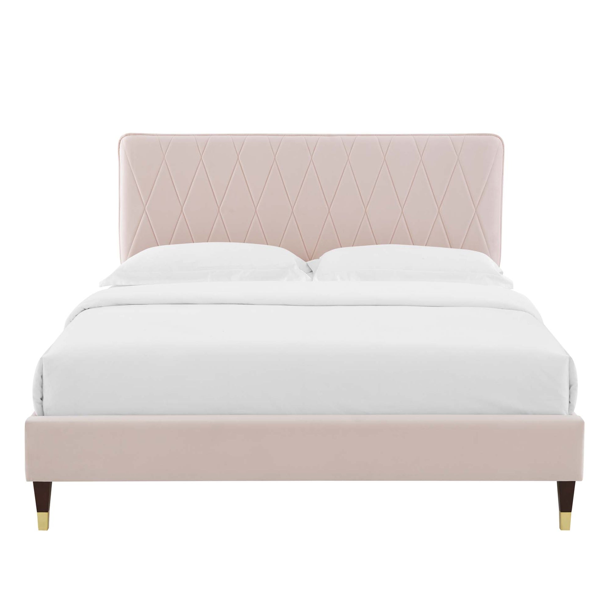 Offer glam deco style and vintage modern elegance to a teenager's bedroom or guest bedroom decor with the Phillipa Performance Velvet Full Platform Bed. The padded headboard of this full size bed features a beautiful intersecting diamond design. Rich in glam deco style and vintage modern elegance, this upholstered bed is covered in stain-resistant performance velvet and is a sturdy mattress foundation for memory foam, innerspring, latex, and hybrid mattresses. Eliminating the need for a box spring, the MDF frame of this full platform bed is complete with a wood slat support system crafted with poplar for lasting durability and support. This slatted bed frame rests on gold metal legs with non-marking foot caps and includes a reinforced center beam with two support legs for enhanced stability. Assembly required. Full Bed Weight Capacity: 800 lbs.
