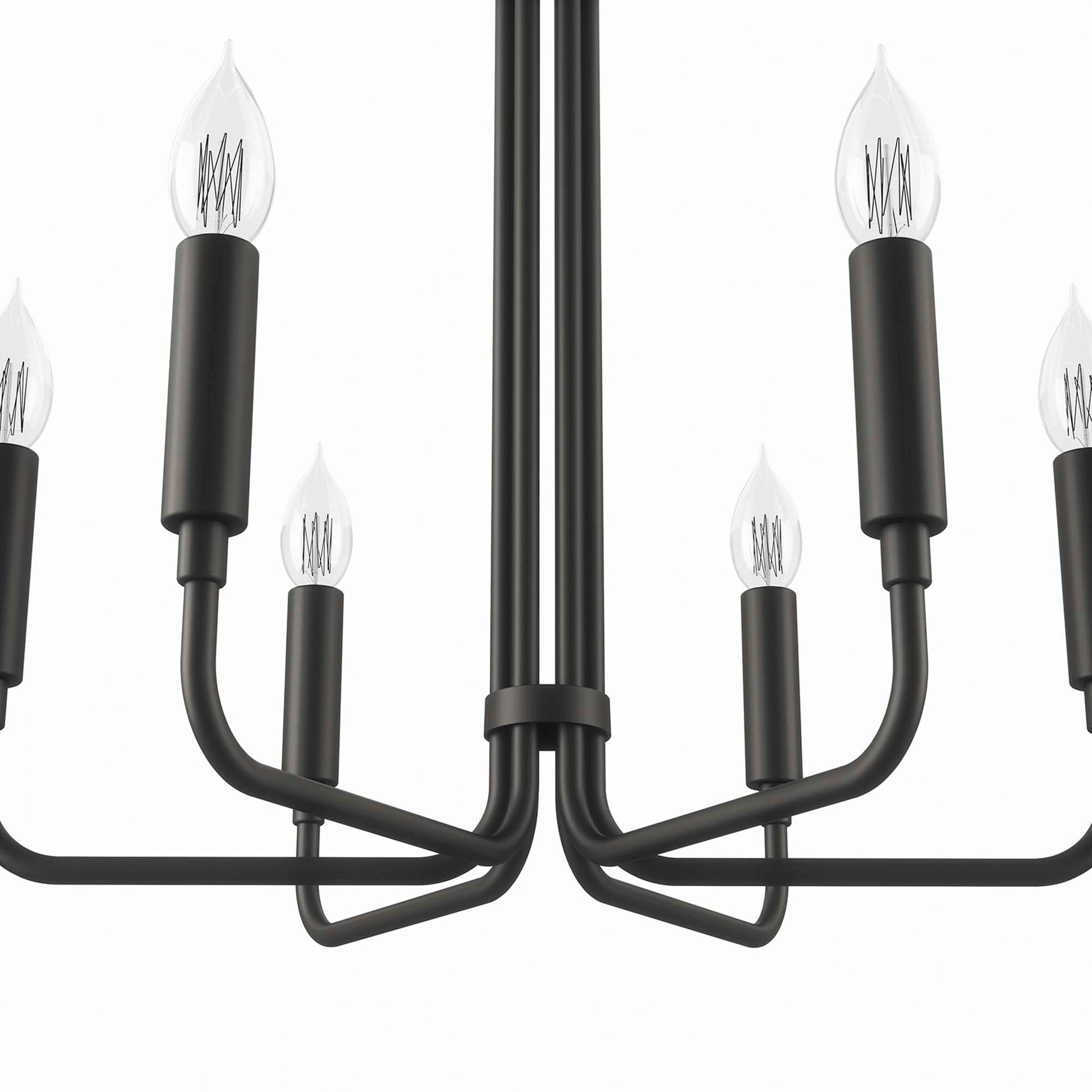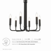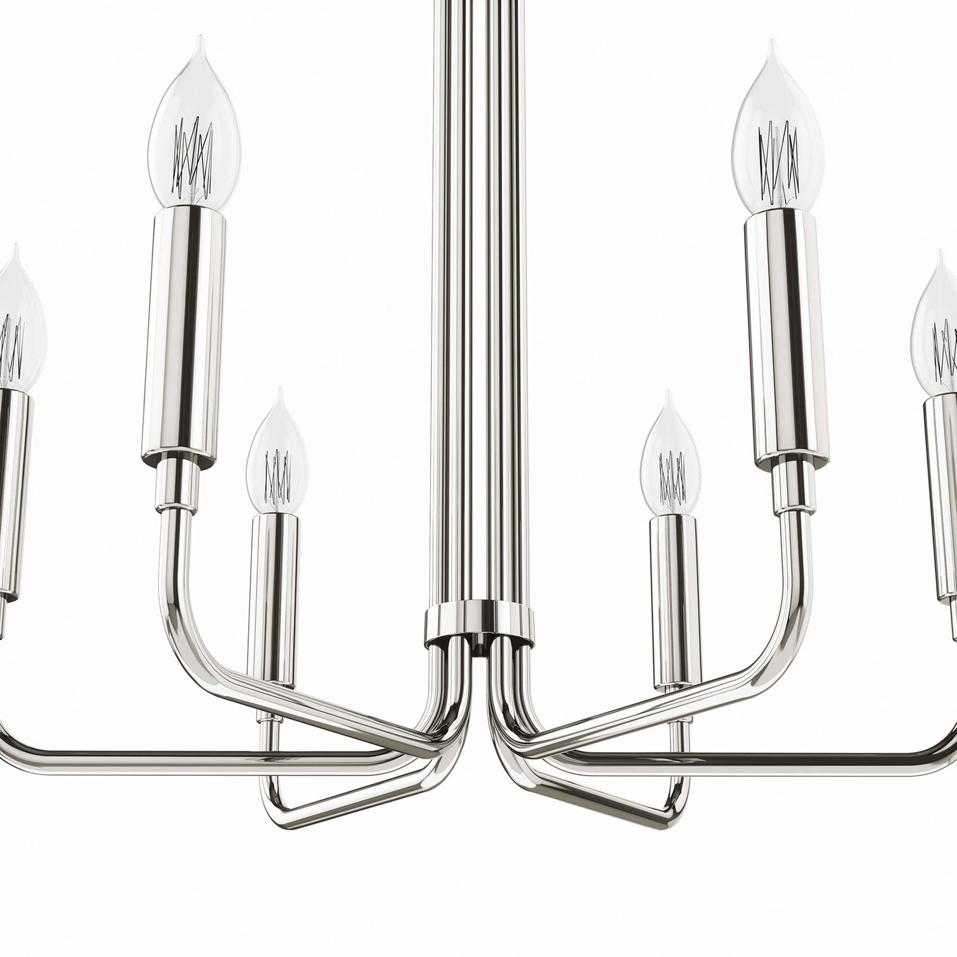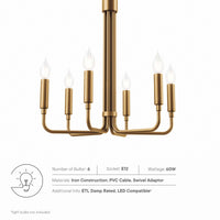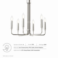 Illuminate your living space with the artful elegance of the Rekindle 6-Light Chandelier that complements a variety of decors from mid-century modern to minimalist contemporary. A timeless piece for your living room, dining room, entryway, or office space, this chandelier light features six sleek arms that extend out from a cylindrical centerpiece with ceramic lamp holders to host exposed light bulbs. Compatible with sloped ceilings, Rekindle has a ceiling canopy with a swivel adaptor and features a five piece, height-adjustable hanging rod to suit a range of ceiling heights. The Rekindle Light Fixture is ETL listed for damp locations and requires six E12 light bulbs 60W max or LED equivalent (not included). Luminaires that are “Suitable for Damp Locations” are approved for areas that are regularly exposed to moisture and condensation. Professional installation required.