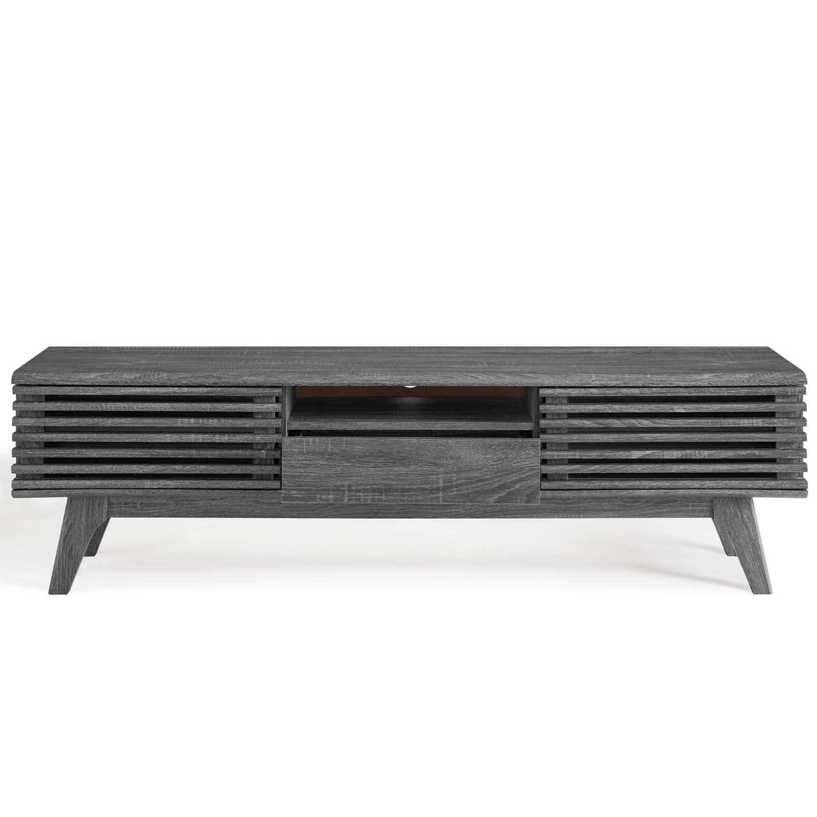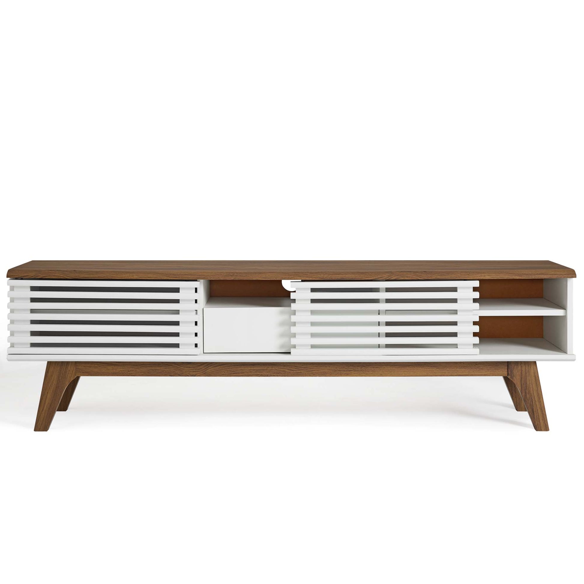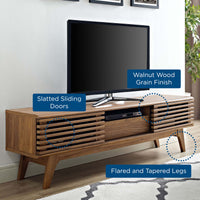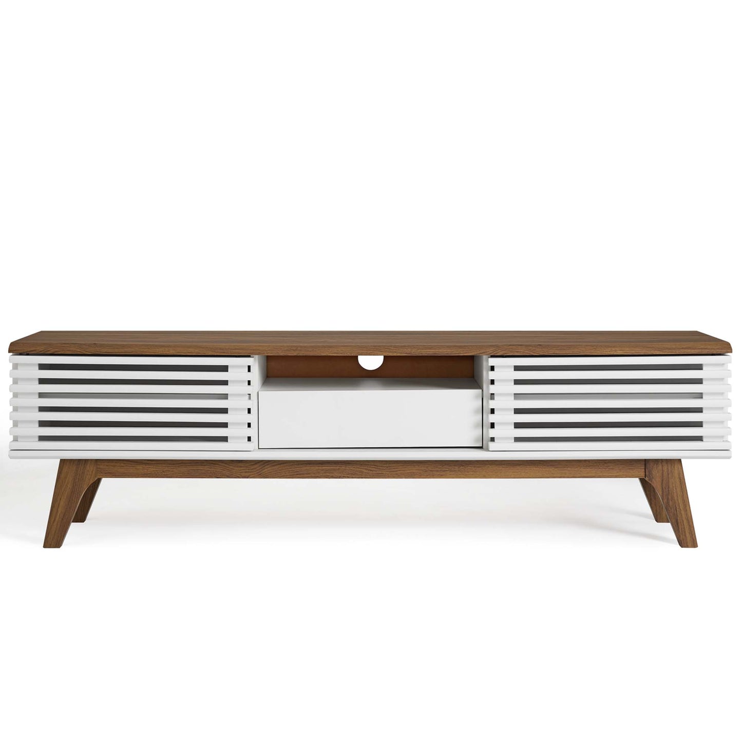 Tap into mid-century aesthetics with the Render 59” TV Stand. Render features a durable particleboard frame with smooth walnut grain laminate, four tapered wood legs, full-extension center drawer with shelf on top, non-marking foam foot pads, and opposite side adjustable shelves with dual slatted sliding doors for sophisticated media storage. Complete with a center cable management hole, Render’s contemporary linear style is the perfect addition to the modern living room, lounge or recreation area.