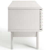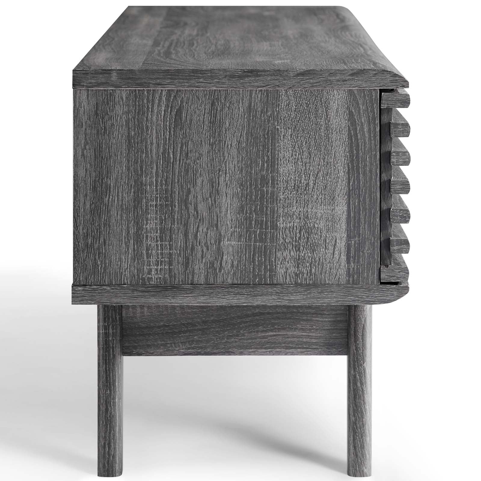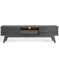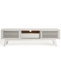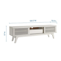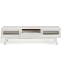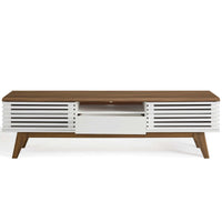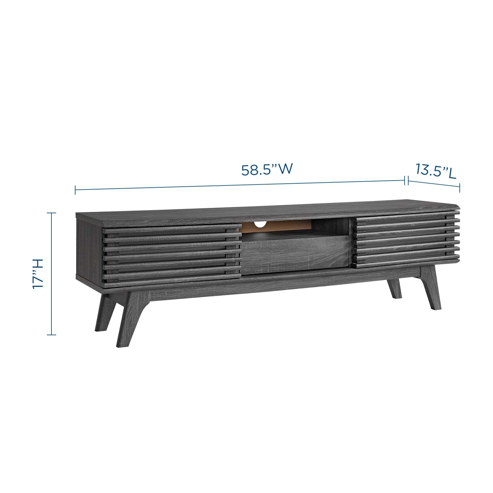 Tap into mid-century aesthetics with the Render 59” TV Stand. Render features a durable particleboard frame with smooth walnut grain laminate, four tapered wood legs, full-extension center drawer with shelf on top, non-marking foam foot pads, and opposite side adjustable shelves with dual slatted sliding doors for sophisticated media storage. Complete with a center cable management hole, Render’s contemporary linear style is the perfect addition to the modern living room, lounge or recreation area.
