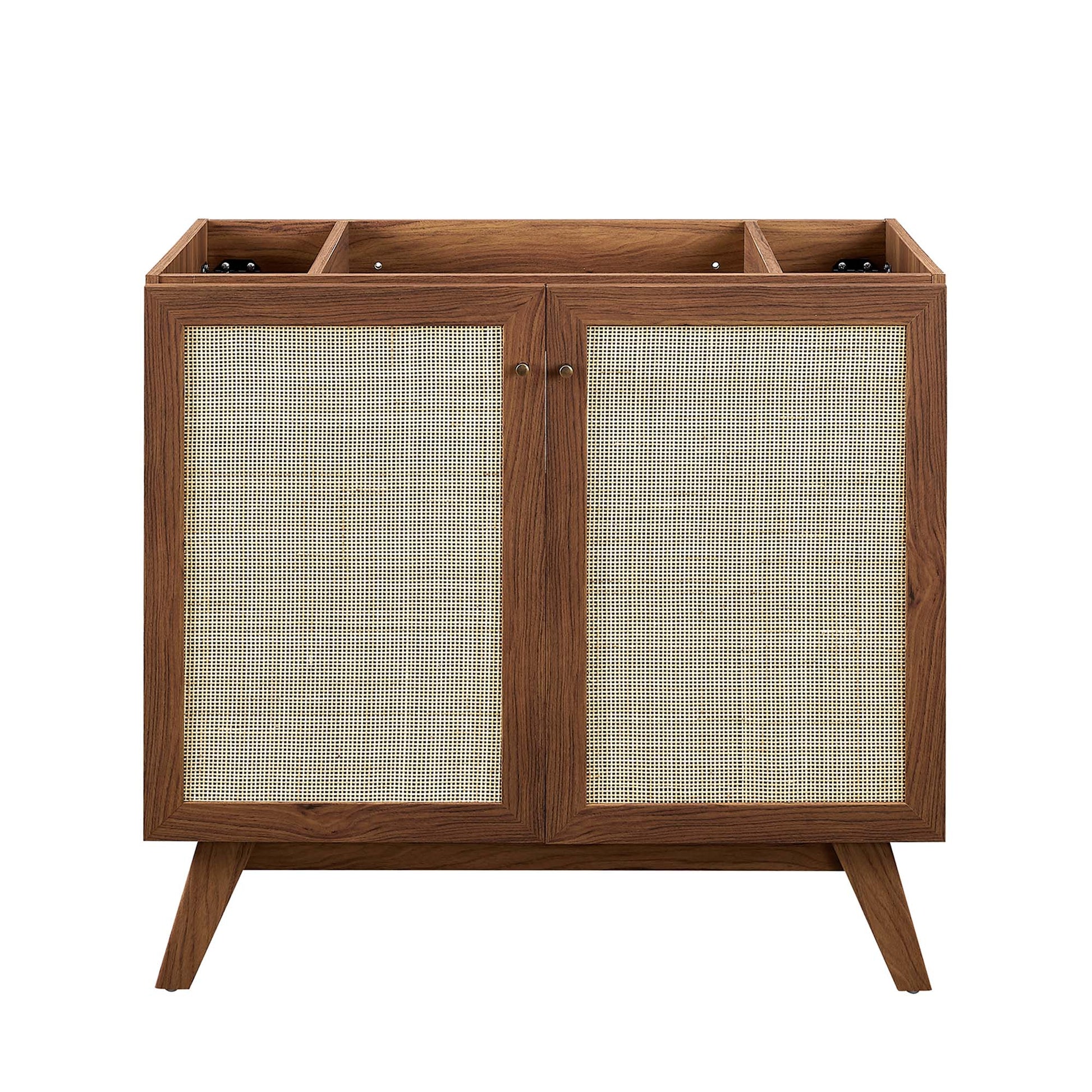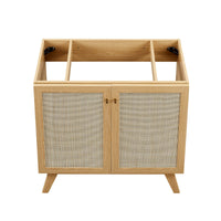 Introduce refreshing style to your restroom with the Soma 36” Bathroom Vanity. Showcasing a beautiful rattan weave on the cupboard doors, this vanity brings organic aesthetics and modern functionality to any bathroom or powder room. Crafted from durable MDF and particleboard with a natural wood grain finish, this vanity boasts a ceramic sink basin with 8-inch centerset holes and an integrated countertop. This vanity features an adjustable shelf, providing easy customization for arranging towels, toiletries, and bathroom necessities. Complete with metal doorknobs with a brushed gold finish and soft-close hinges, this bathroom vanity cabinet is designed for quiet and effortless functionality. Resting on splayed legs, the Soma Bathroom Vanity includes non-marking foot caps to protect flooring. Assembly required. Fixtures not included.