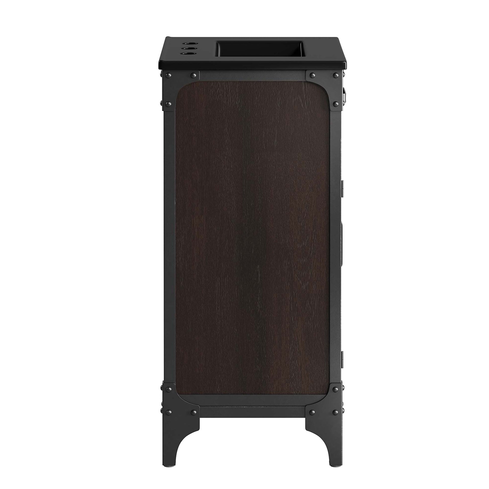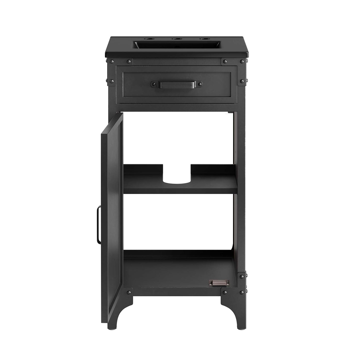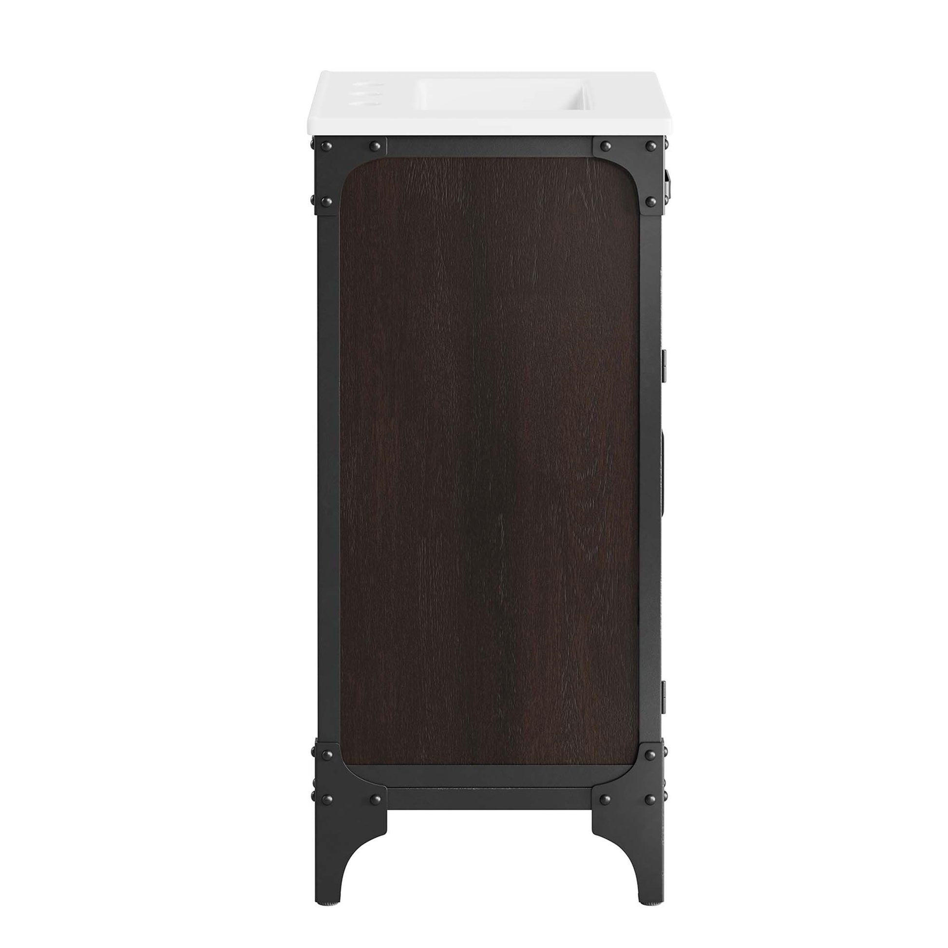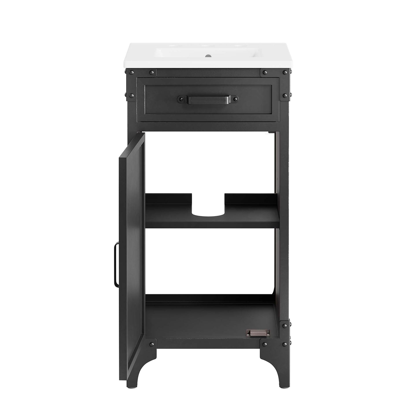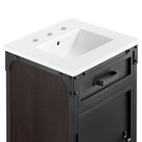 Experience the perfect blend of functionality and industrial modern style with the Steamforge 18" Bathroom Vanity. Crafted from sturdy metal with an antique patina and MDF with a beautiful wood grain veneer, this bathroom vanity cabinet brings a touch of utilitarian elegance to your bathroom decor. With a fixed drawer, pivot hinges, and spacious shelving complete with a plumbing cutout, this vanity provides ample storage space for all your bathroom essentials. The ceramic sink basin boasts an integrated countertop with 8" centerset holes, ready for your chosen fixtures (not included). With non-marking foot pads to protect your flooring, this bathroom vanity offers the ideal balanace of design and practicality.