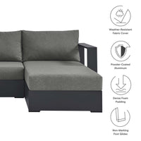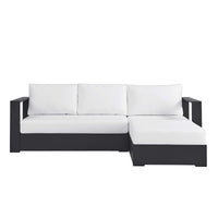 Enliven your alfresco spaces with the Tahoe Aluminum Outdoor Patio 2-Piece Sectional Sofa. This modern sectional sofa is constructed with well-crafted, durable powder-coated aluminum, dispensing contemporary elegance in your outdoor lounge spaces. Its dense foam padding ensures sustained comfort, making it ideal for poolside lounging or as outdoor deck furniture, complete with UV and water-resistant fabric-covered seats and backrests. The cushion covers are removable for easy machine washing. Part of a modular outdoor furniture collection, this 2-Piece sectional sofa offers adaptability and style while entertaining or relaxing. The entire Tahoe aluminum patio furniture set features non-marking foot glides to protect your deck or patio floor and comes with easy-to-follow assembly instructions. Set Includes: 1 Left-Facing Loveseat (Weight Capacity: 661 lbs.), 1 Right-Facing Chaise (Weight Capacity: 661 lbs.)