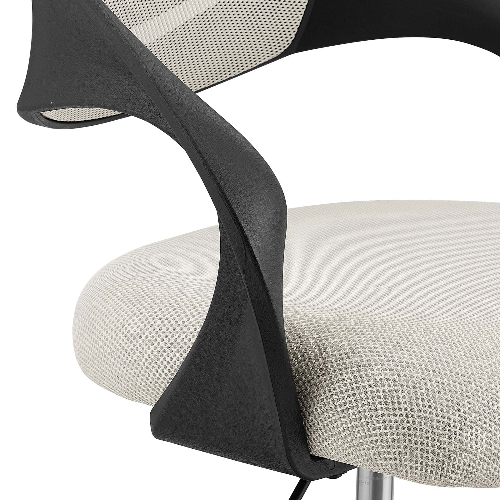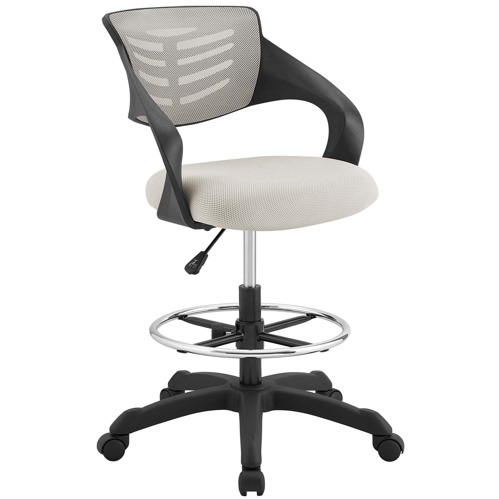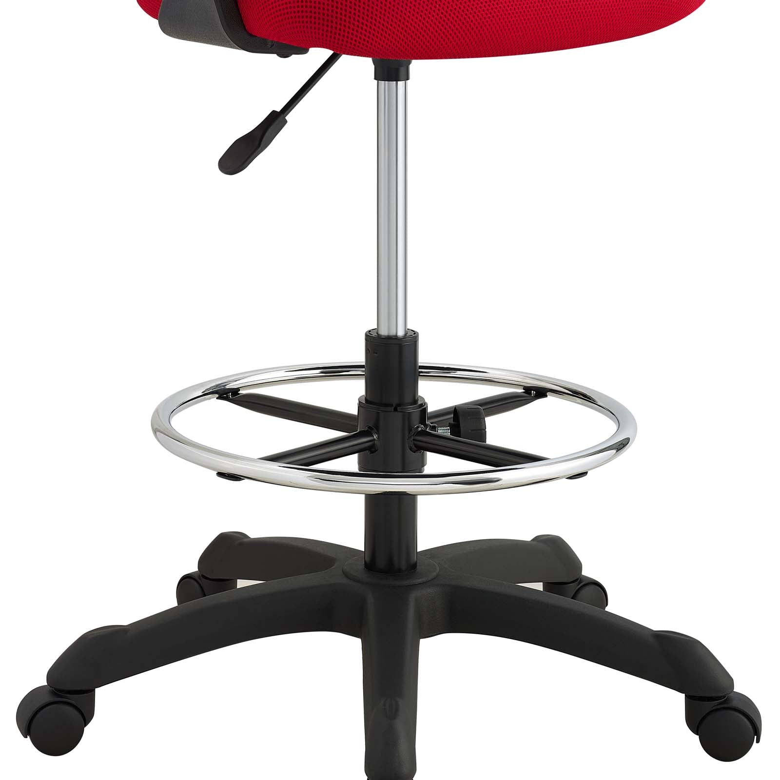 Energize your office decor with Thrive. This sturdy nylon frame drafting chair comes with a breathable mesh back which combines passive lumbar support and cooling comfort. Spiraling armrests imbue a creative vibe, while the densely padded mesh seat and adjustable foot ring keep you ergonomically supported. Complete with one-touch height adjustment, full 360-degree swivel, and five dual-wheel casters for natural movement of either carpeted or hardwood surfaces, Thrive is a drafting stool that stands to be at the forefront of your work endeavors.