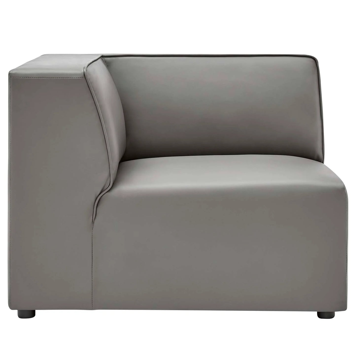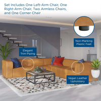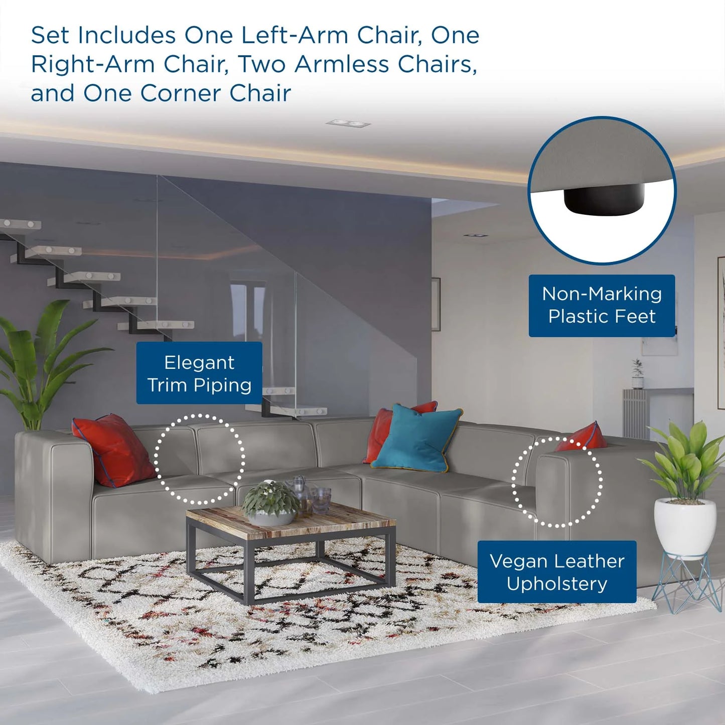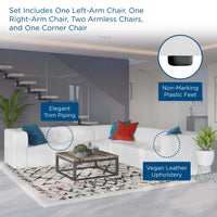 • Kick back and relax with the Mingle Vegan Leather 5-Piece Sectional Sofa. Designed to wash away the hindrances that obstruct visual space, this sectional sofa set comes expansively designed with generous seating and dense foam padding that allows for just the right amount of giving. Mingle easily positions according to the needs of the moment and features rich vegan leather upholstery with elegant piping and plastic legs for steady support. Host animated living or lounge room get-togethers with a modular sectional sofa seating assortment perfect for contemporary modern décors. Set Includes: Left-Arm Chair, Right-Arm Chair, Corner Chair, 2 Armless Chairs