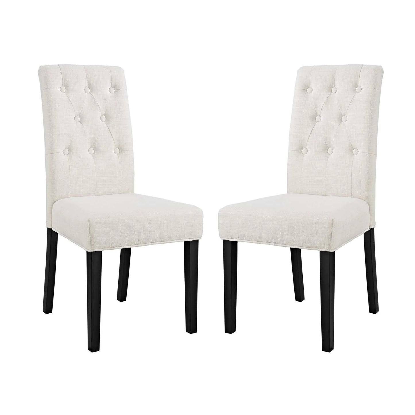• Endow your dining room with vintage glamour style Confer Button Tufted Fabric Upholstered Dining Side Chair set. Confer Dining Accent Chair luxuriously combines dense foam padding with soft and durable fabric upholstery for a singular piece of comfortable elegance. Fashioned with eight tufted buttons and supported by a solidly constructed wood frame and stained hardwood legs, Confer Fabric Upholstered Dining Side Chair is a richly designed piece that blankets your dining experience in a layer of magnificence.