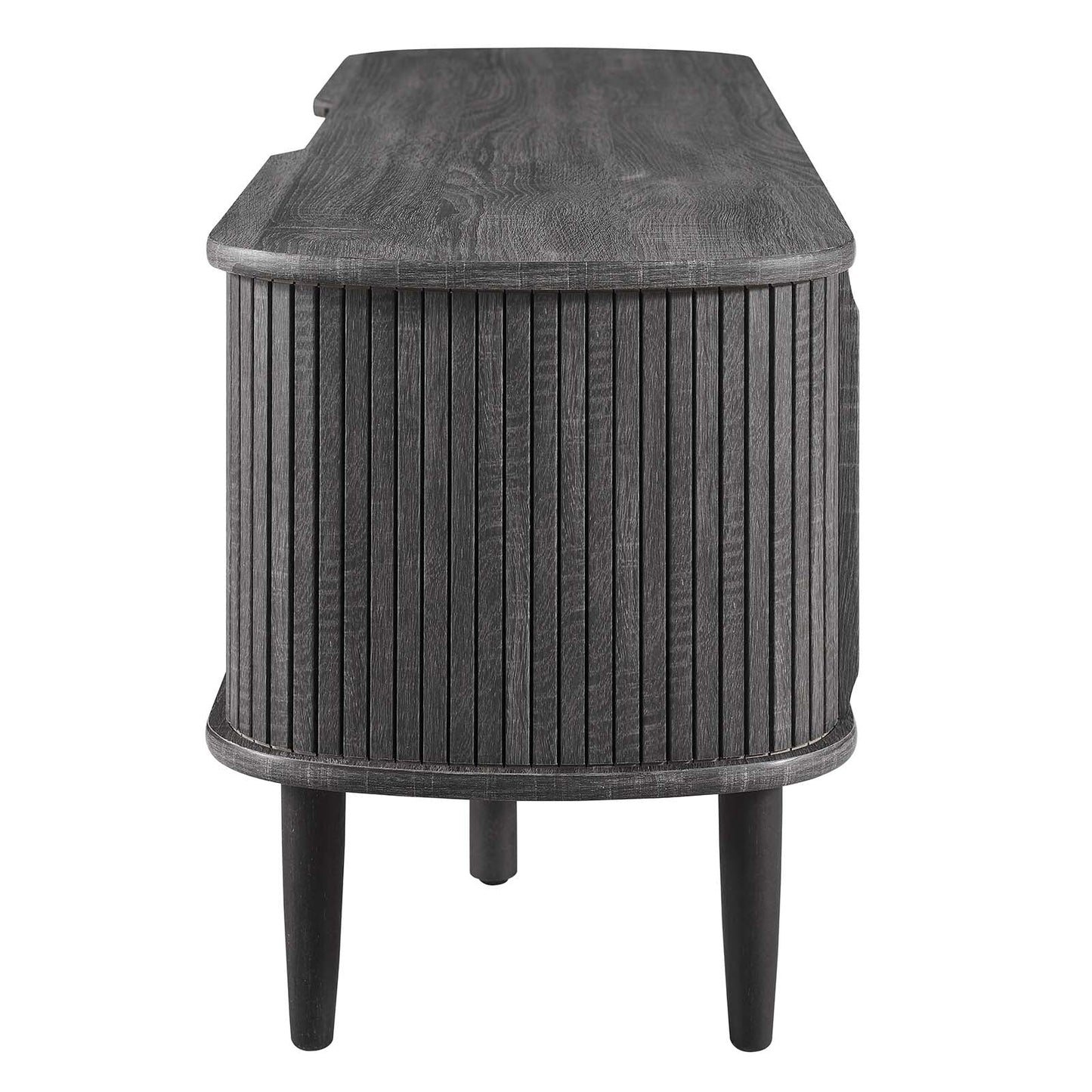 • Invite mid-century aesthetics into your living space with the Contour 55" TV Stand. Contour features retro beadboard and an organic silhouette and stands on four tapered legs with two support legs. Crafted with rubberwood, MDF, and particleboard, this entertainment console is complete with a center storage area with an adjustable shelf and open back, as well as two side storage areas with sliding doors to conceal. This media stand accommodates TVs up to 60" and is the perfect modern addition to the living room, lounge area, or recreation room. Assembly required. Weight Capacity: 163 lbs.