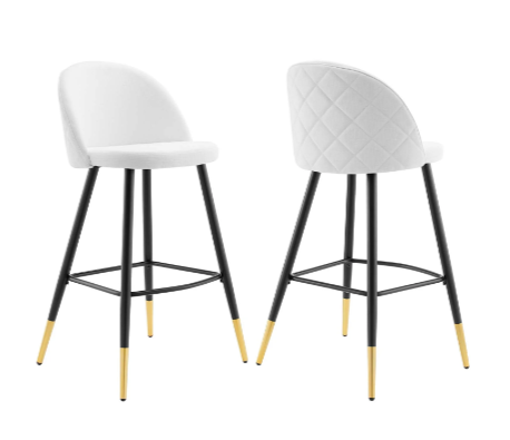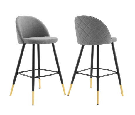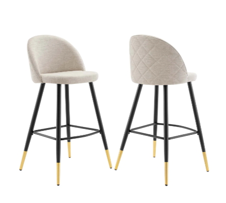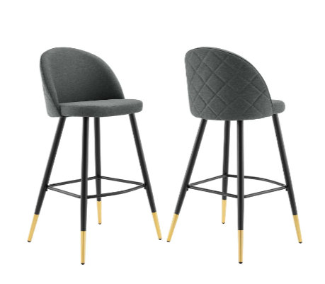 Inspire whimsical dining and functional style with the Corine Fabric Upholstered Bar Stools- Set of 2. Featuring a rounded silhouette with French piping detail and a diamond lattice pattern along the back, these upholstered bar stools are covered in soft polyester fabric and padded in dense foam to grant supportive comfort while dining or relaxing. A versatile addition to a kitchen counter or bar table, this bar stool set rests atop black metal legs with gold accents and non-marking foot caps. Bar Stool Weight Capacity: 300 lbs.