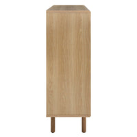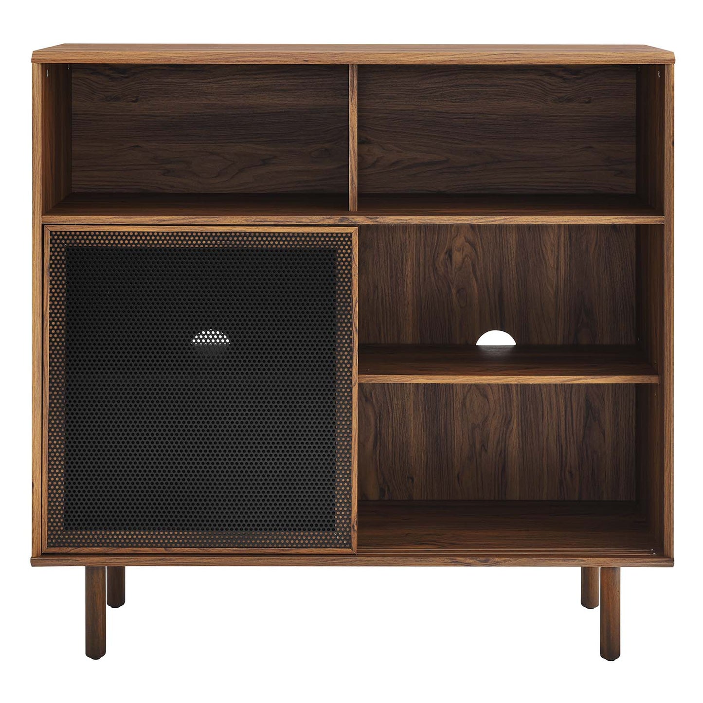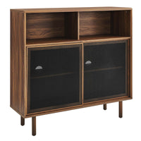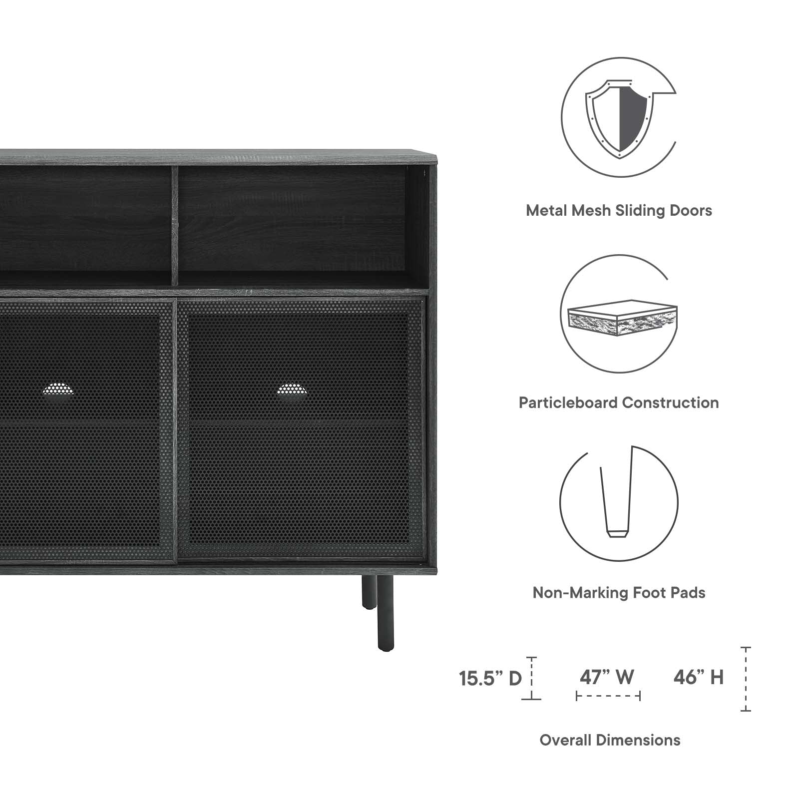 • Bring urban flare to your living space with the modern design of the Kurtis 47" Display Cabinet. Featuring sliding metal mesh doors, this storage cabinet brings industrial design to a living room, lounge area, bedroom, home office, or hallway. This versatile display cabinet is crafted from MDF and particleboard with a natural wood grain design. Offering ample storage space for media essentials, linens, decor, or anything else that suits your needs, this sideboard features open shelving areas partially concealed by mesh sliding doors allowing for both storage and display. Resting on sturdy wood legs with non-marking felt pads to protect flooring, this sideboard doubles as a high TV stand that can accommodate TVs up to 52 inches. Assembly required. Weight Capacity: 181 lbs.