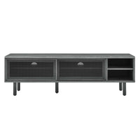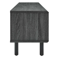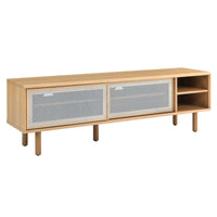 • Bring urban flare to your living space with the modern design of the Kurtis 60" TV Stand. Featuring sliding metal mesh doors, this entertainment center brings industrial design to the living room, bedroom, home office, or lounge area. This media stand is crafted from MDF and particleboard with a natural wood grain design. Offering ample storage space for all your media essentials, this TV console features an open shelving area concealed by mesh sliding doors with cable management holes that keep things organized and allow for flow through ventilation. Resting on sturdy wood legs with non-marking foot pads to protect flooring, this low-profile TV stand accommodates flat screen TVs up to 65 inches. Assembly required. Weight Capacity: 200 lbs.