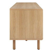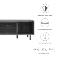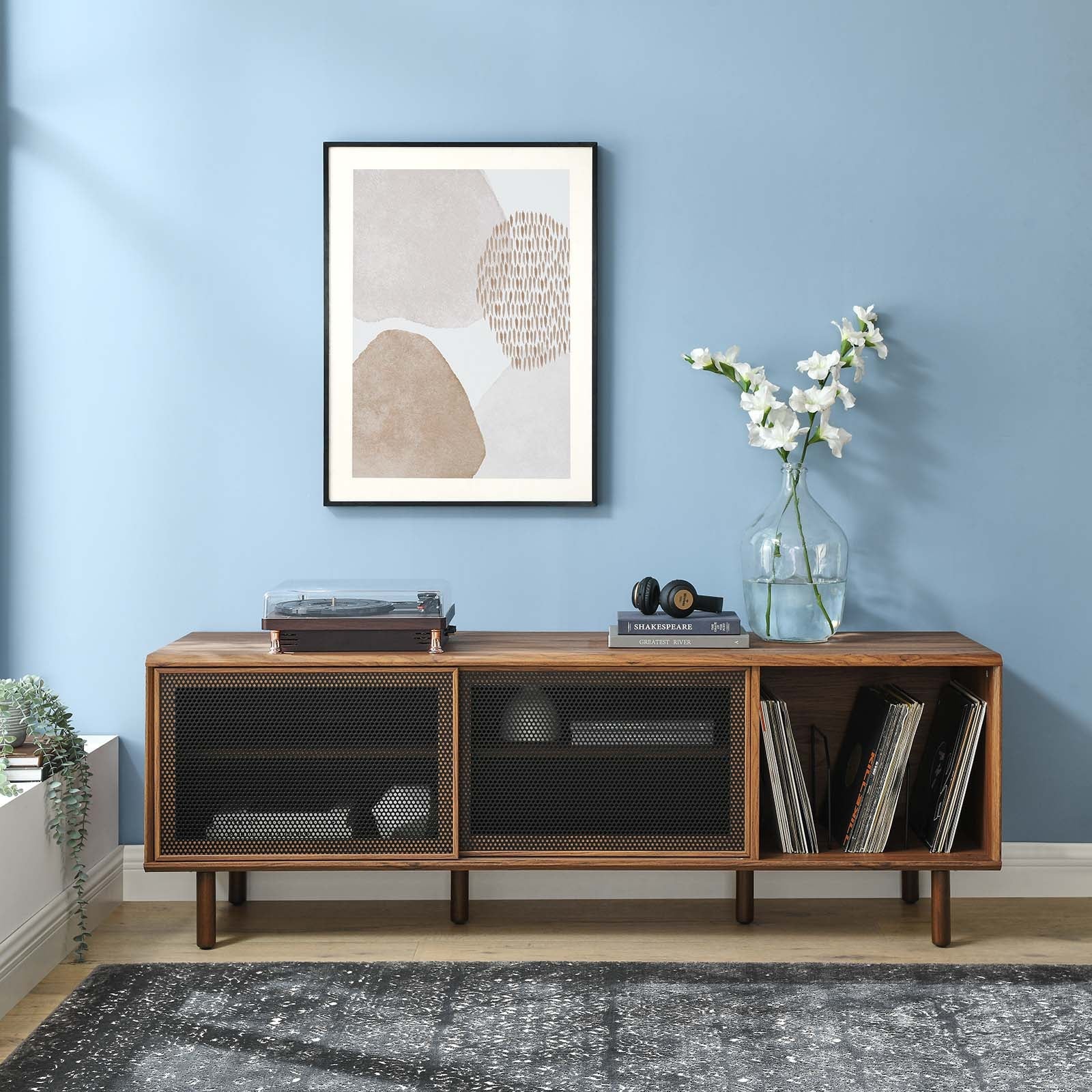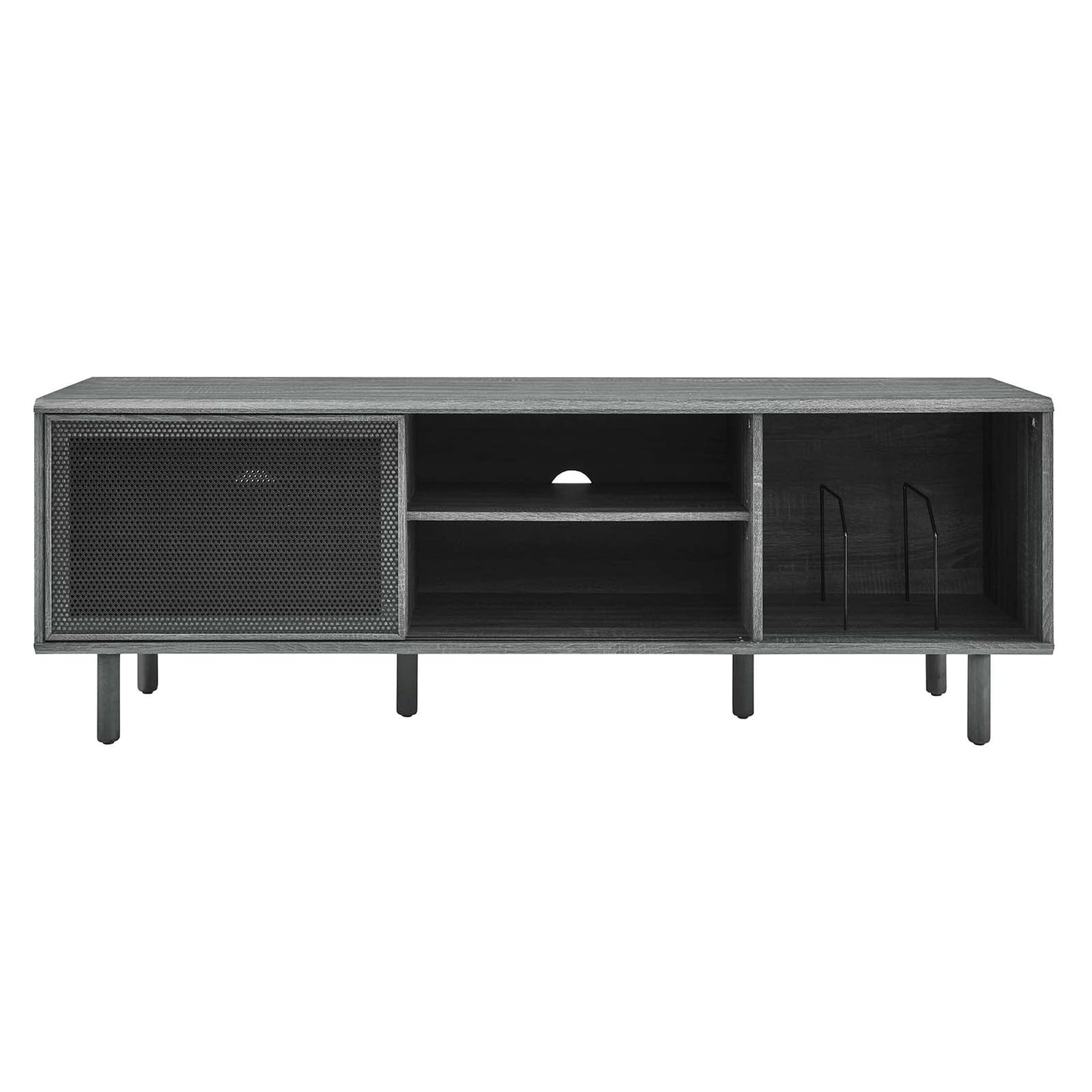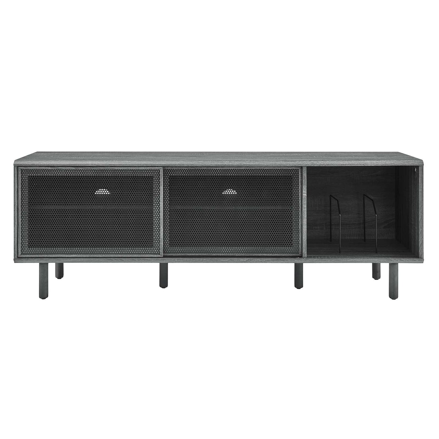 • Bring urban flare to your living space with the modern design of the Kurtis 67" TV and Vinyl Record Display Stand. Featuring sliding metal mesh doors, this entertainment center brings industrial design to the living room, bedroom, home office, or lounge area. This media stand is crafted from MDF and particleboard with a natural wood grain design. Offering ample storage space for all your media essentials, this TV console features an open shelving area concealed by mesh sliding doors with cable management holes that keep things organized and allow for flow through ventilation. Display your vinyl record collection with the metal dividers on this versatile display stand. Resting on sturdy wood legs with non-marking foot pads to protect flooring, this low-profile TV stand accommodates flat screen TVs up to 65 inches. Assembly required. Weight Capacity: 200 lbs.