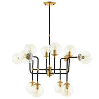 Reach the perfect blend of industrial, retro, and farmhouse inspiration with the Ambition Pendant Chandelier. A sculptural artform that makes a statement, this ceiling light fixture is beautiful in the living room, entryway, bedroom, or dining room. Matte black metal rods combine with antique brass sockets and light fixtures for a stunning display of vintage modern design. Suspended from a stylish matte black rod, with a flush antique brass wall mount, Ambition casts a golden glow with twelve amber glass globe shades that impeccably illuminate your surroundings. A versatile industrial modern pendant light chandelier for any contemporary space, Ambition requires twelve E12 25W bulbs (not included).