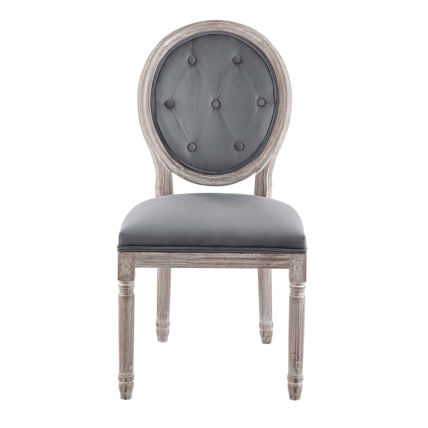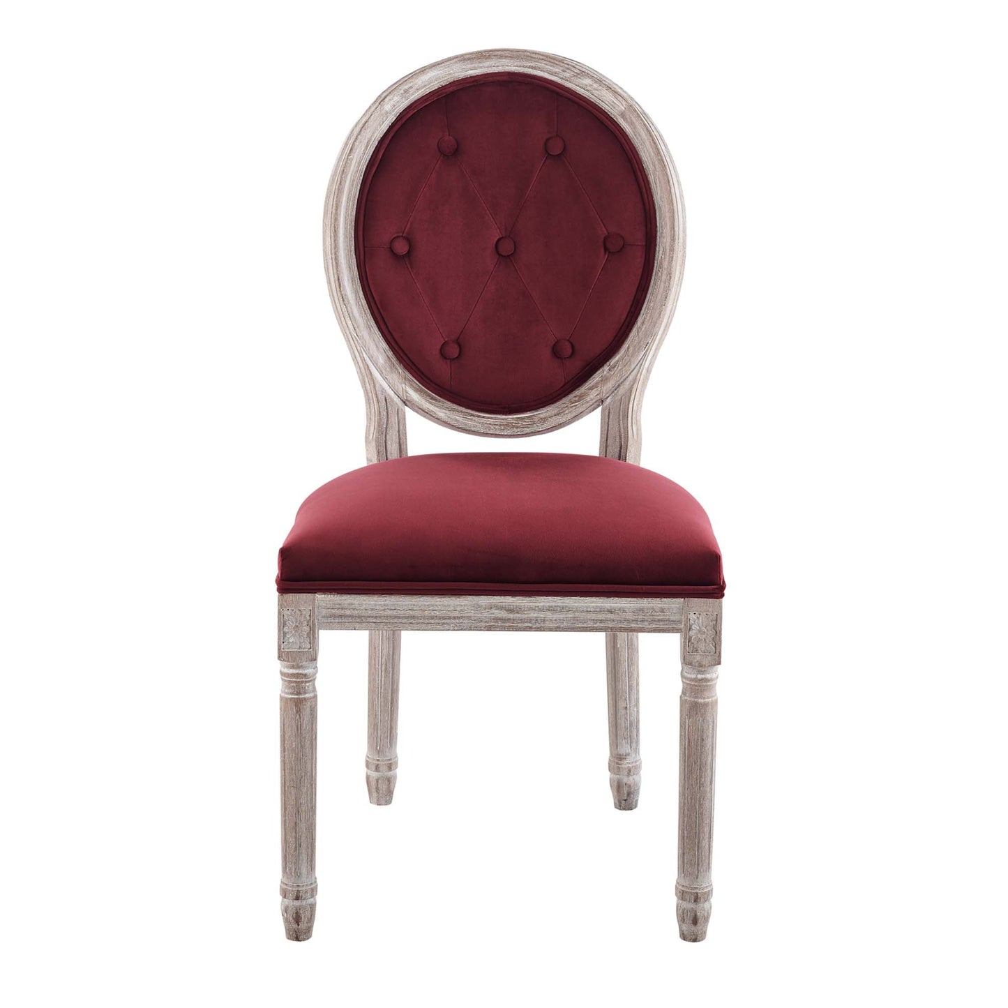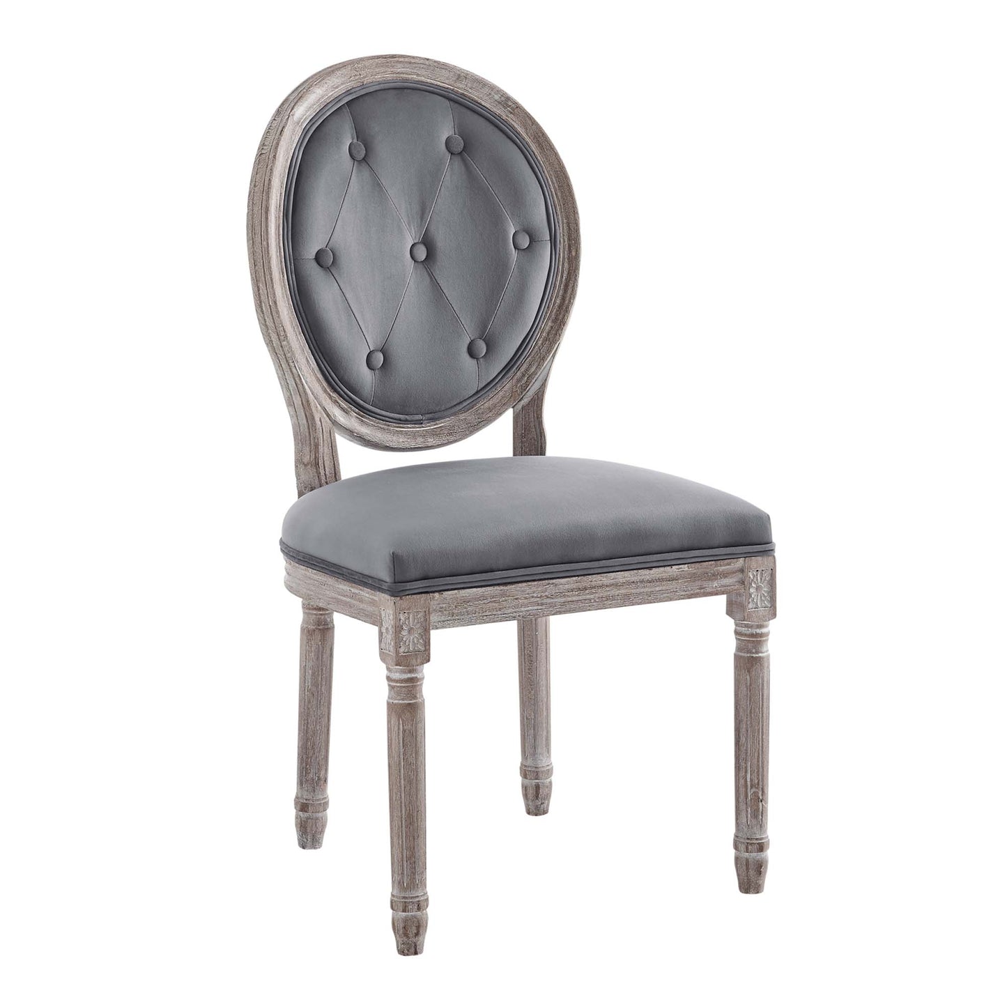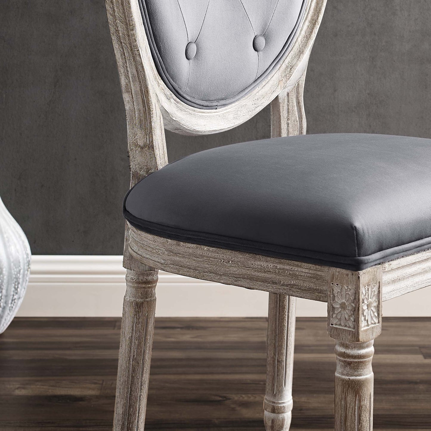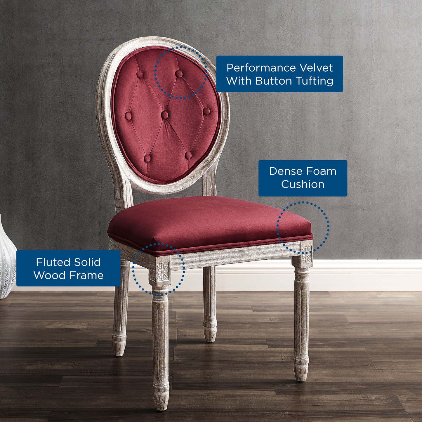 Revel in the whispered opulence of the Arise Dining Side Chair. Featuring a fluted wood frame, button tufted diamond trim, elegant welting, dense foam padding, an upholstered performance velvet seat, this oval back dining or accent chair elegantly blends old world charm with modern intrigue. Designed with a vintage French look and an undeniable appeal, Arise supports up to 331 pounds and comes with foot pads to preserve flooring. Comes fully assembled.