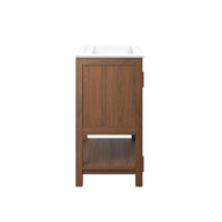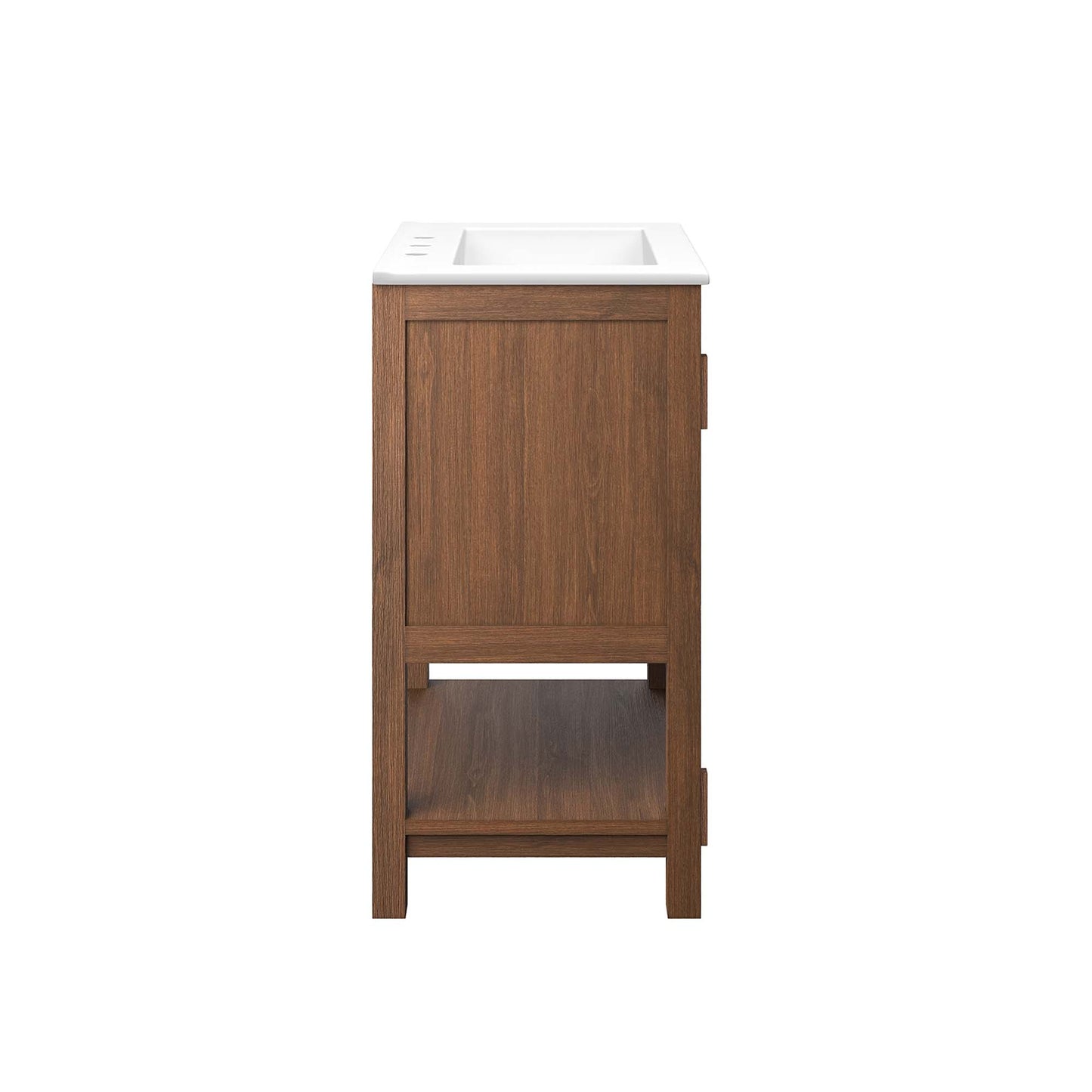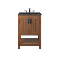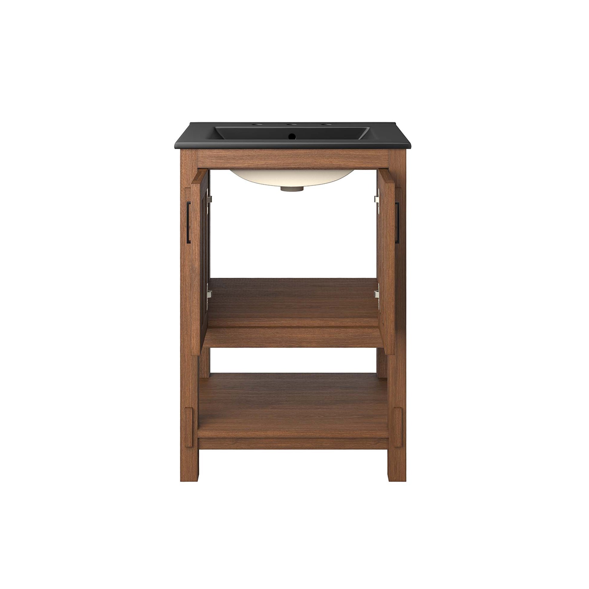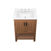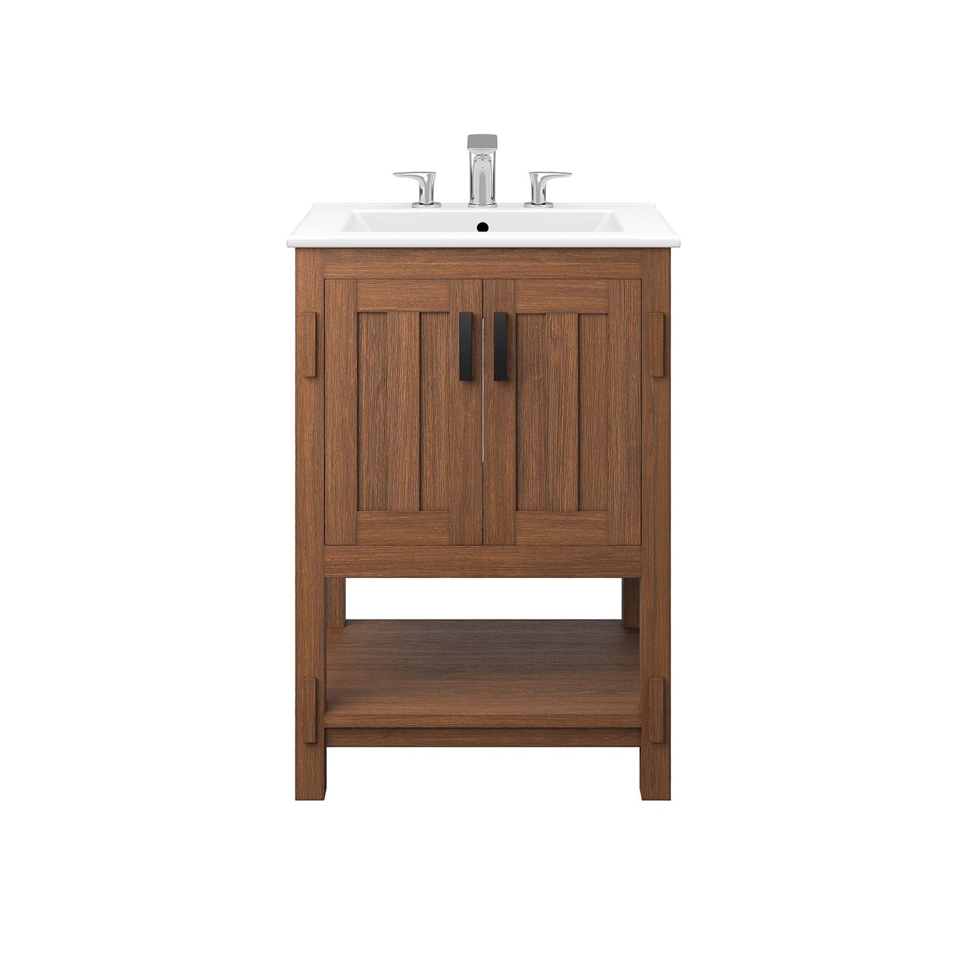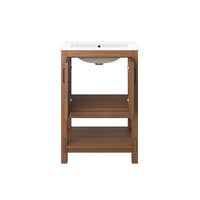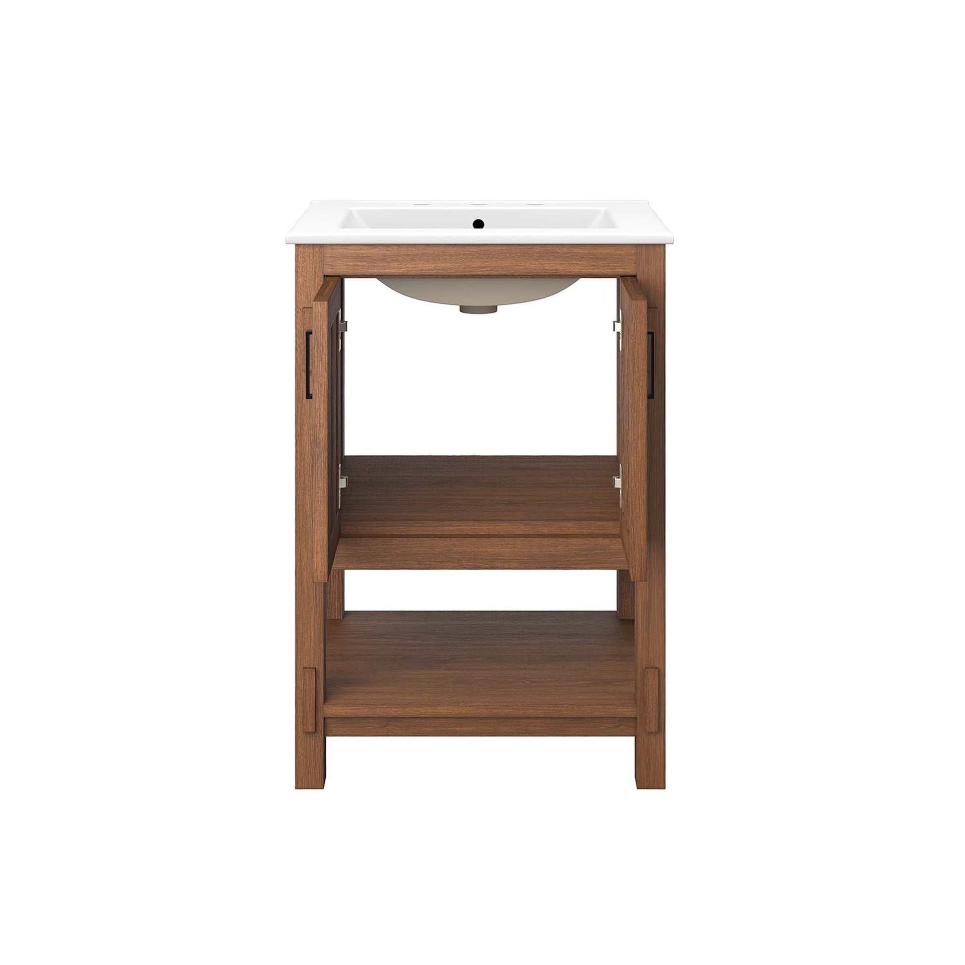 Fusing mid-century design and modern style, the Ashlyn 24" Bathroom Vanity brings organic charm to your bathroom ambiance. Crafted from durable mindi wood, the frame and legs are highlighted by four prominent wooden accents, amplifying the design. Two soft-close doors open to reveal a spacious shelf, ideal for towels, toiletries, and other essentials. Below the enclosed space is an open shelf, perfect for easy-access items or decorative elements. This bathroom vanity features a ceramic sink basin with 8" centerset holes and integrated countertop. Includes non-marking foot caps to protect flooring. Sink fixtures not included. Assembly required. Weight Capacity: 200 lbs.