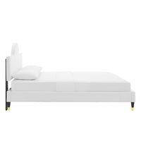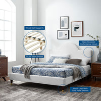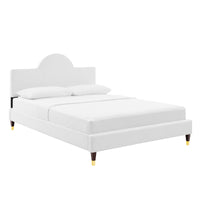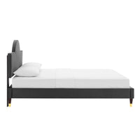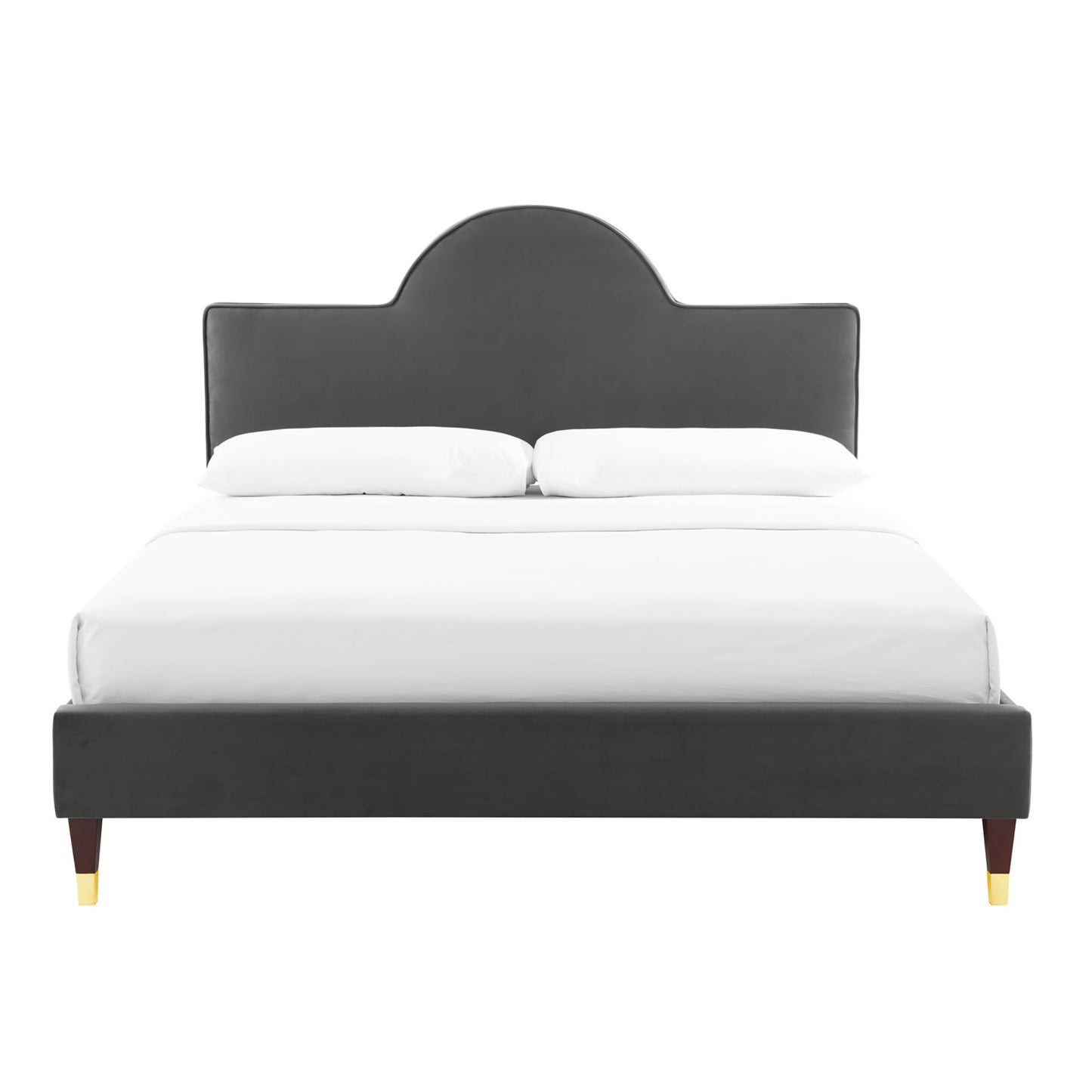 Awaken a master bedroom or guest bedroom with the energizing style of the Aurora Performance Velvet King. Offering luxe texture and a glam deco look, the king headboard of this bed features an arching silhouette reminiscent of the morning sunrise. This king size bed is upholstered in stain-resistant performance velvet and padded with dense foam creating a soft, supportive place to rest and relax while sitting up in bed. Eliminating the need for a box spring, the MDF frame of this king bed is complete with a wood slat support system crafted with poplar for lasting durability and support. A sturdy mattress foundation for memory foam, innerspring, latex, and hybrid mattresses, this slatted bed frame rests atop wood legs with gold sleeves and non-marking foot caps and includes a reinforced center beam with two support legs for enhanced stability. King Bed Weight Capacity: 800 lbs.