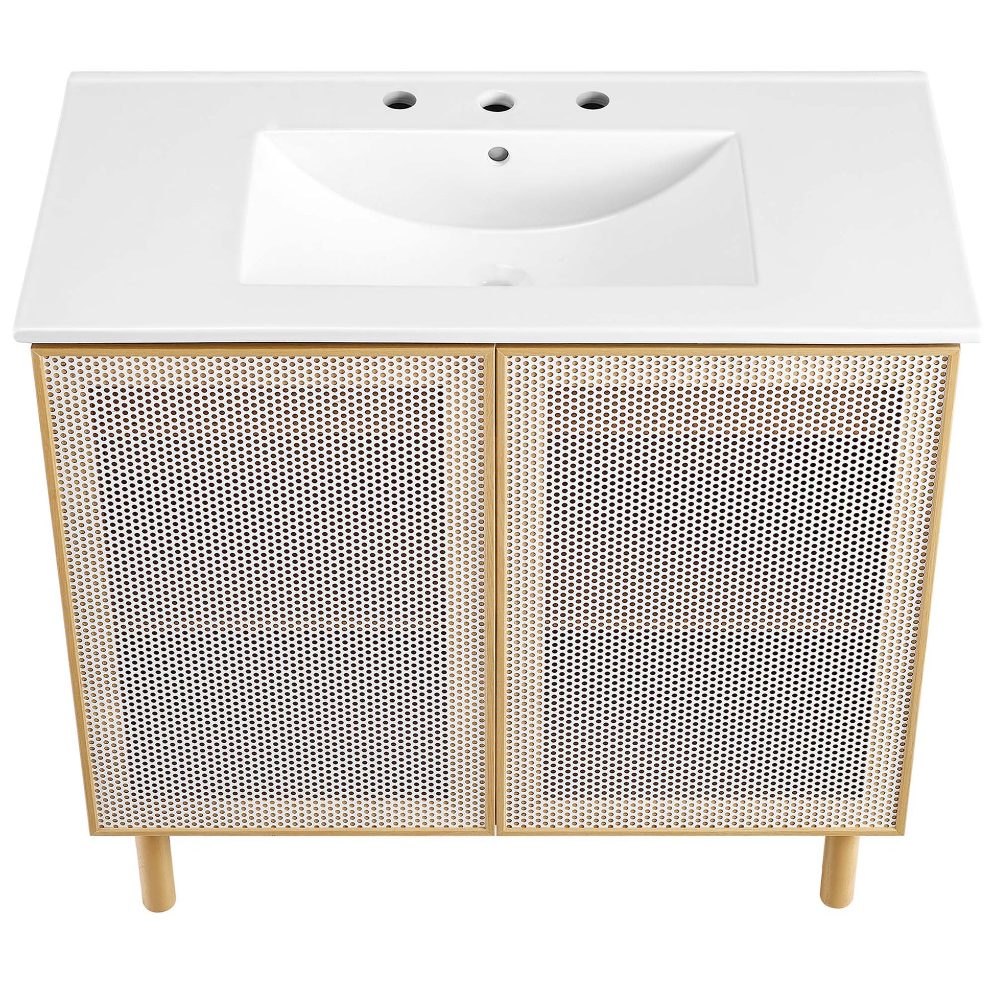 Elevate your bathroom space with the Calla 36" Bathroom Vanity, where contemporary design meets everyday practicality. This single bathroom vanity features a durable particleboard construction with a smooth laminate finish that adds a modern touch to your bathroom decor. The unique perforated metal door fronts of this bathroom sink cabinet offer a stylish update while concealing ample storage space for all your bathroom essentials. This small space vanity single is customizable with its adjustable shelf, designed to accommodate your plumbing needs with ease. The push-to-open doors and sleek dowel legs highlight its minimalist design, while the bathroom vanity sink's non-marking, adjustable foot levelers protect your flooring. A high-quality ceramic sink basin with 8" centerset holes completes the look, ready for faucet installation (not included). The Calla vanity sink requires simple assembly, with clear instructions to guide you through the setup. Fixtures not included.
