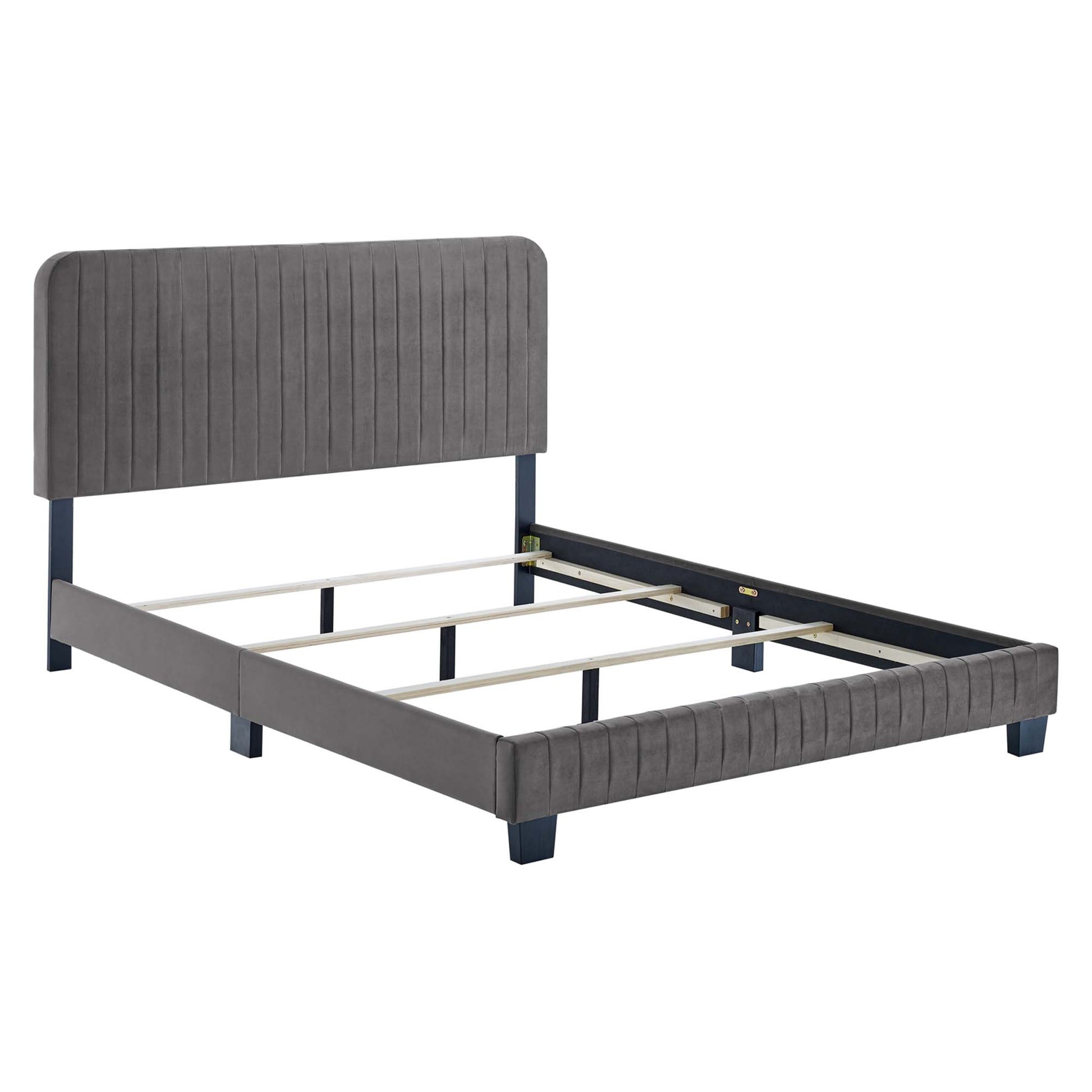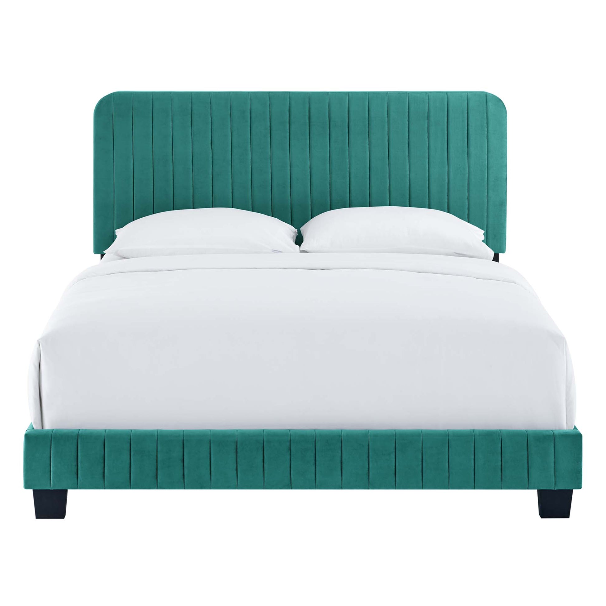 Elevate your guest bedroom or teenager's bedroom style with the luxe texture and glam deco elegance of the Celine Full Bed. Adorned with channel tufted detail, the full size headboard of this upholstered bed is padded in dense foam to offer supportive comfort while sitting up resting, relaxing, reading, or watching TV. Upholstered in stain-resistant performance velvet, this full size bed features support legs for added durability. A sturdy mattress foundation, this full size bed accommodates a variety of mattress styles including innerspring, memory foam, and latex with the use of a box spring. Assembly required. Weight Limit: 700 lbs.