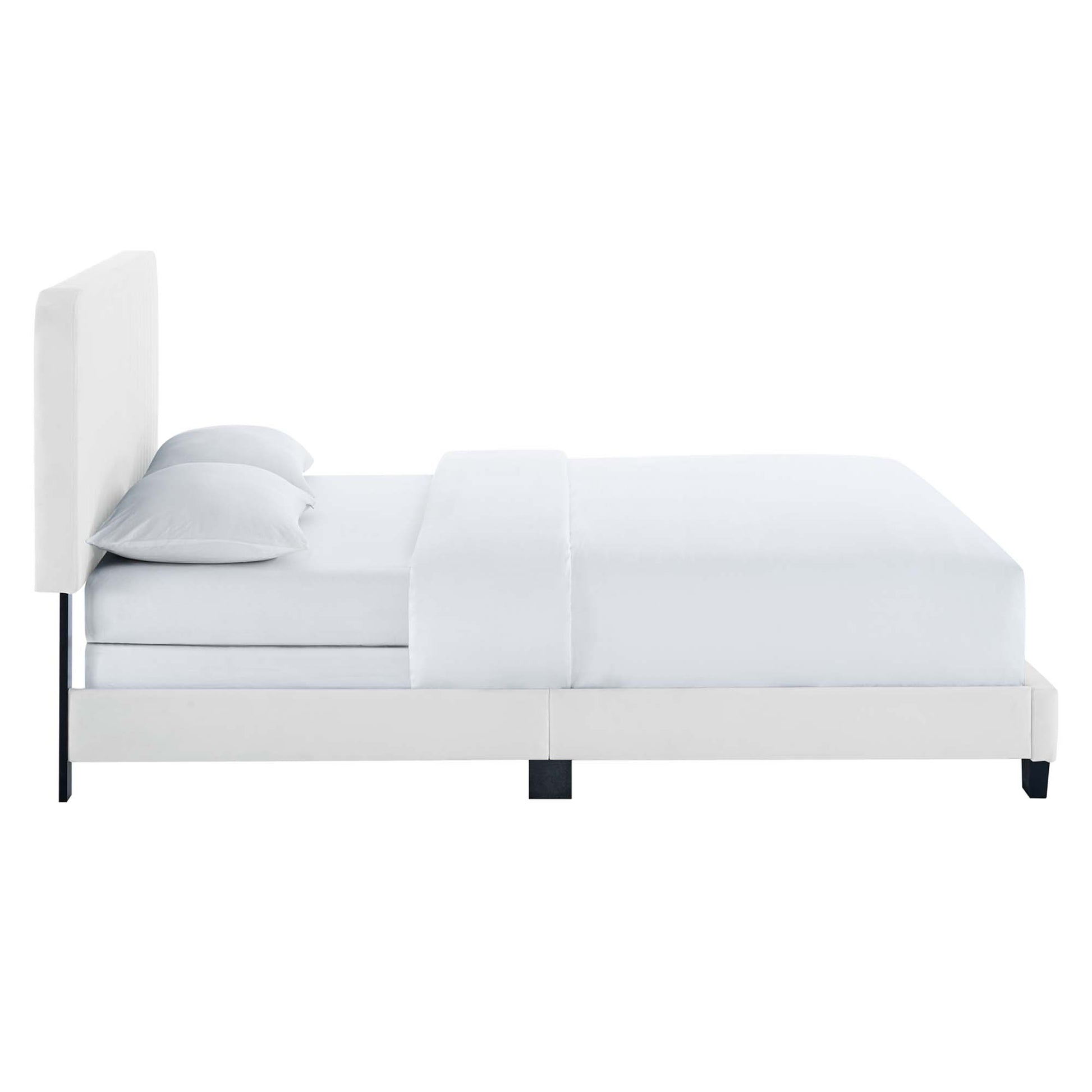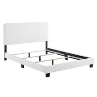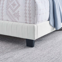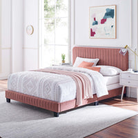 Elevate your master bedroom or guest bedroom style with the luxe texture and glam deco elegance of the Celine King Bed. Adorned with channel tufted detail, the king size headboard of this upholstered bed is padded in dense foam to offer supportive comfort while sitting up resting, relaxing, reading, or watching TV. Upholstered in stain-resistant performance velvet, this king size bed features support legs for added durability. A sturdy mattress foundation, this king size bed accommodates a variety of mattress styles including innerspring, memory foam, and latex with the use of a box spring. Assembly required. Weight Limit: 900 lbs.