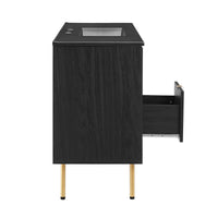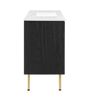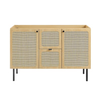 Refresh your washroom with the textured detail of the Chaucer 48" Single Basin Bathroom Vanity. Featuring beautiful rattan weaving on its doors, this vanity cabinet instantly updates any bathroom or powder room. A spacious bottom drawer and a decorative top drawer sit between two hinged doors, each opening to reveal an adjustable top shelf and a fixed bottom shelf, offering ample storage space for toiletries, towels, and other bathroom essentials. With a ceramic basin with 8" centerset holes and an integrated countertop, this vanity’s design highlights its sleek and spacious countertop for an added touch of elegance. Enriched by stylish round metal cabinet knobs on its cabinet doors and a finger edge pull handle on its drawer, this vanity rests on sleek legs with adjustable feet for added stability. Durably crafted with MDF, particleboard, and wood grain laminate this bathroom vanity washbasin brings natural organic aesthetics to your decor. Assembly required. Fixtures not included. Top Shelf Weight Capacity: 24 lbs. Bottom Shelf Weight Capacity: 46 lbs.