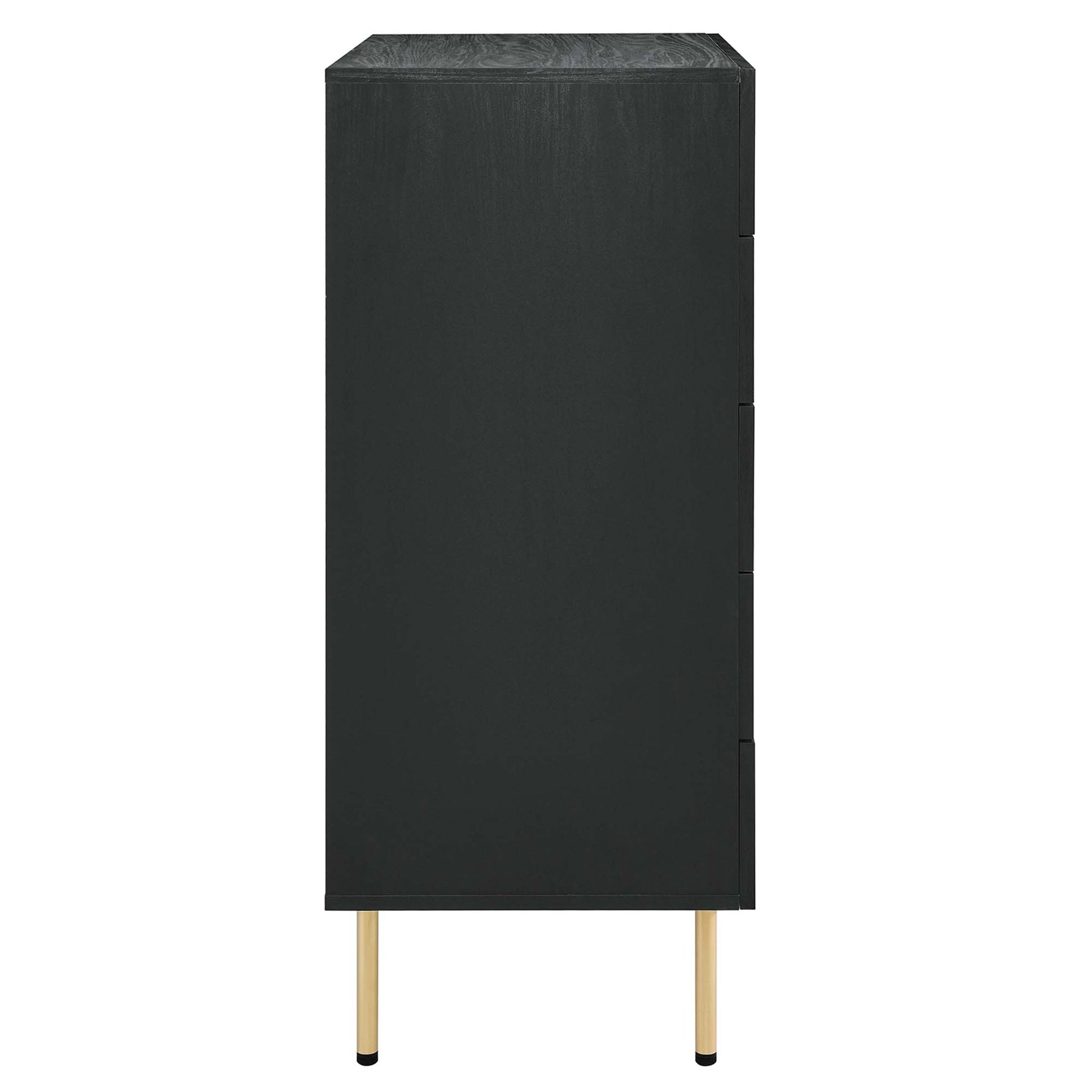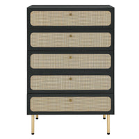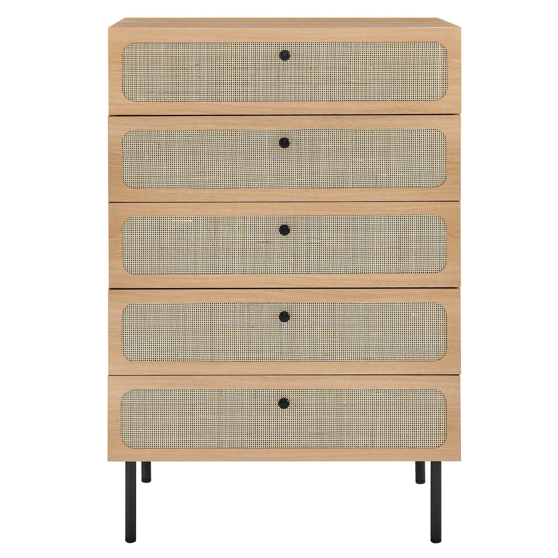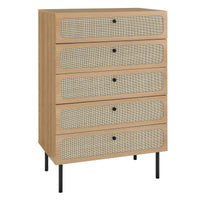 Refresh a bedroom with the textured detail of the Chaucer 5-Drawer Chest. Featuring beautiful oval rattan on the drawer fronts, this 5-drawer chest updates a primary bedroom or guest room. Five spacious full-extension drawers offer ample storage space for clothes, linens, and more. Resting on adjustable feet with non-marking pads, this chest of drawers is durably crafted with particleboard and a wood grain laminate to bring natural organic aesthetics to your bedroom decor. Assembly required.