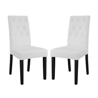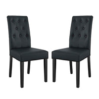 Endow your dining room with vintage glamour style Confer Button Tufted Faux Leather Upholstered Dining Side Chair set. Confer Dining Accent Chair luxuriously combines dense foam padding with fine faux leather upholstery for a singular piece of comfortable elegance. Fashioned with eight tufted buttons and supported by a solidly constructed wood frame and stained hardwood legs, Confer Faux Leather Upholstered Dining Side Chair is a richly designed piece that blankets your dining experience in a layer of magnificence.