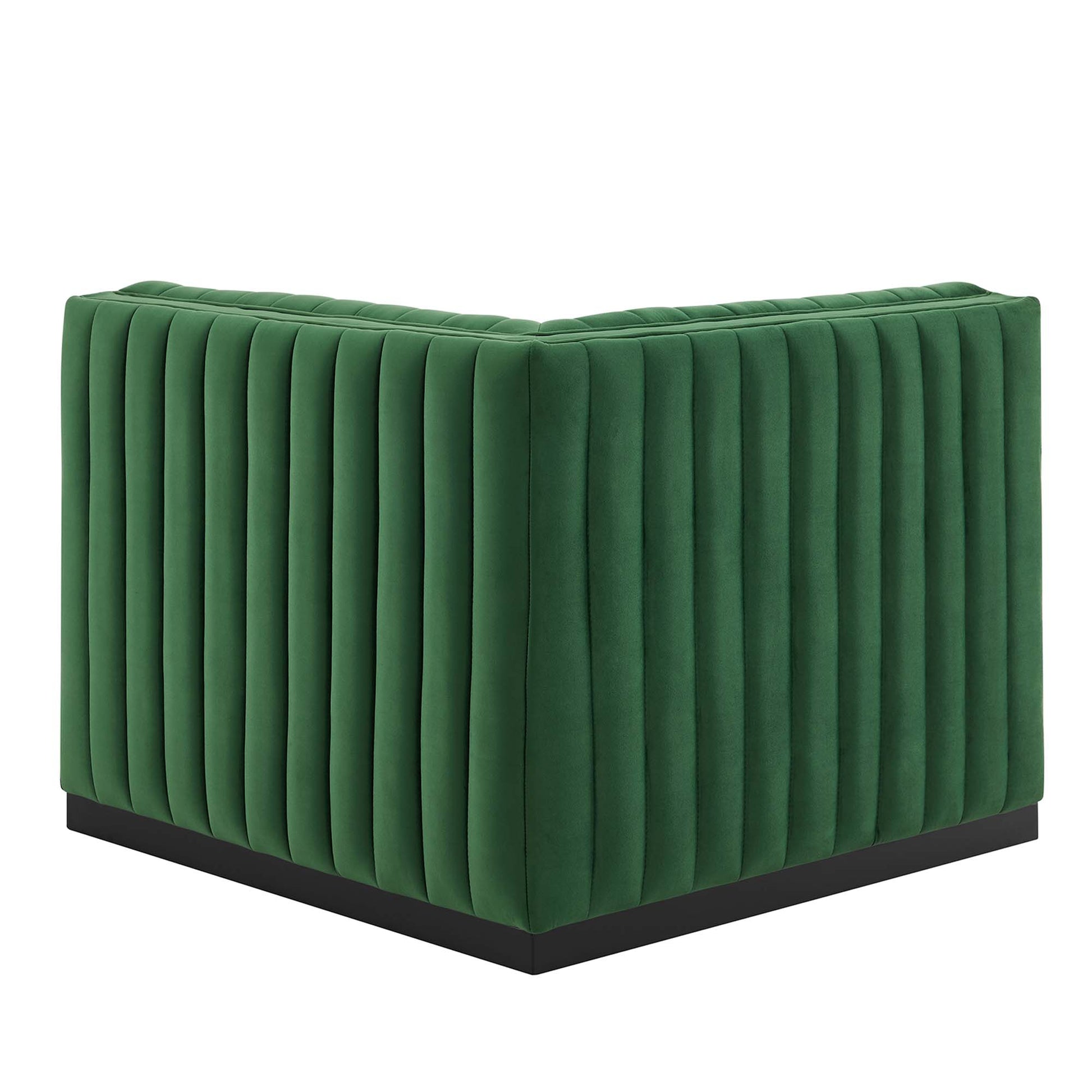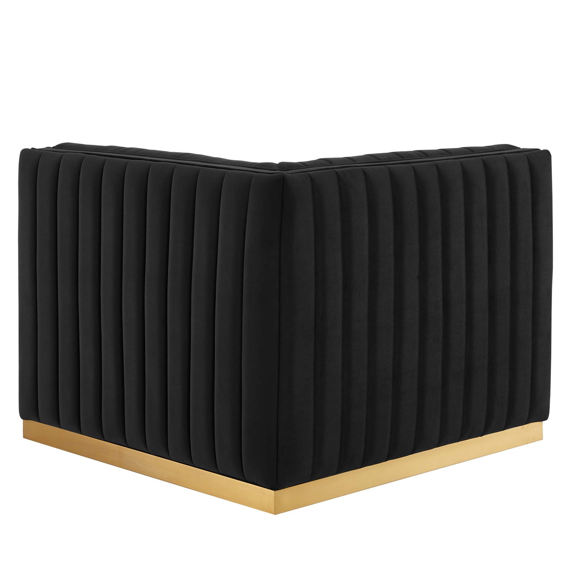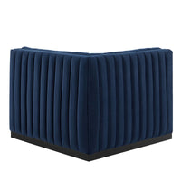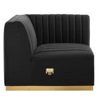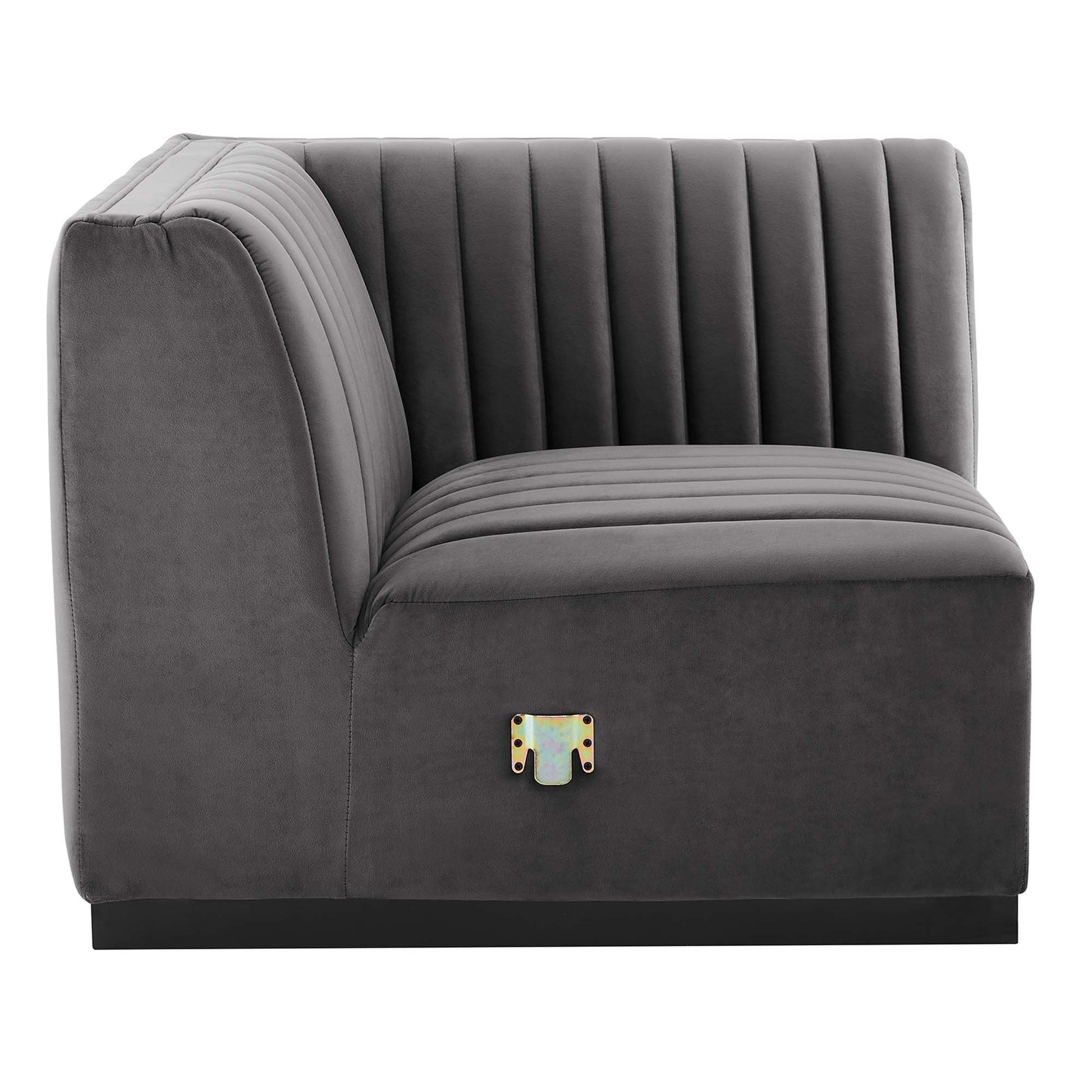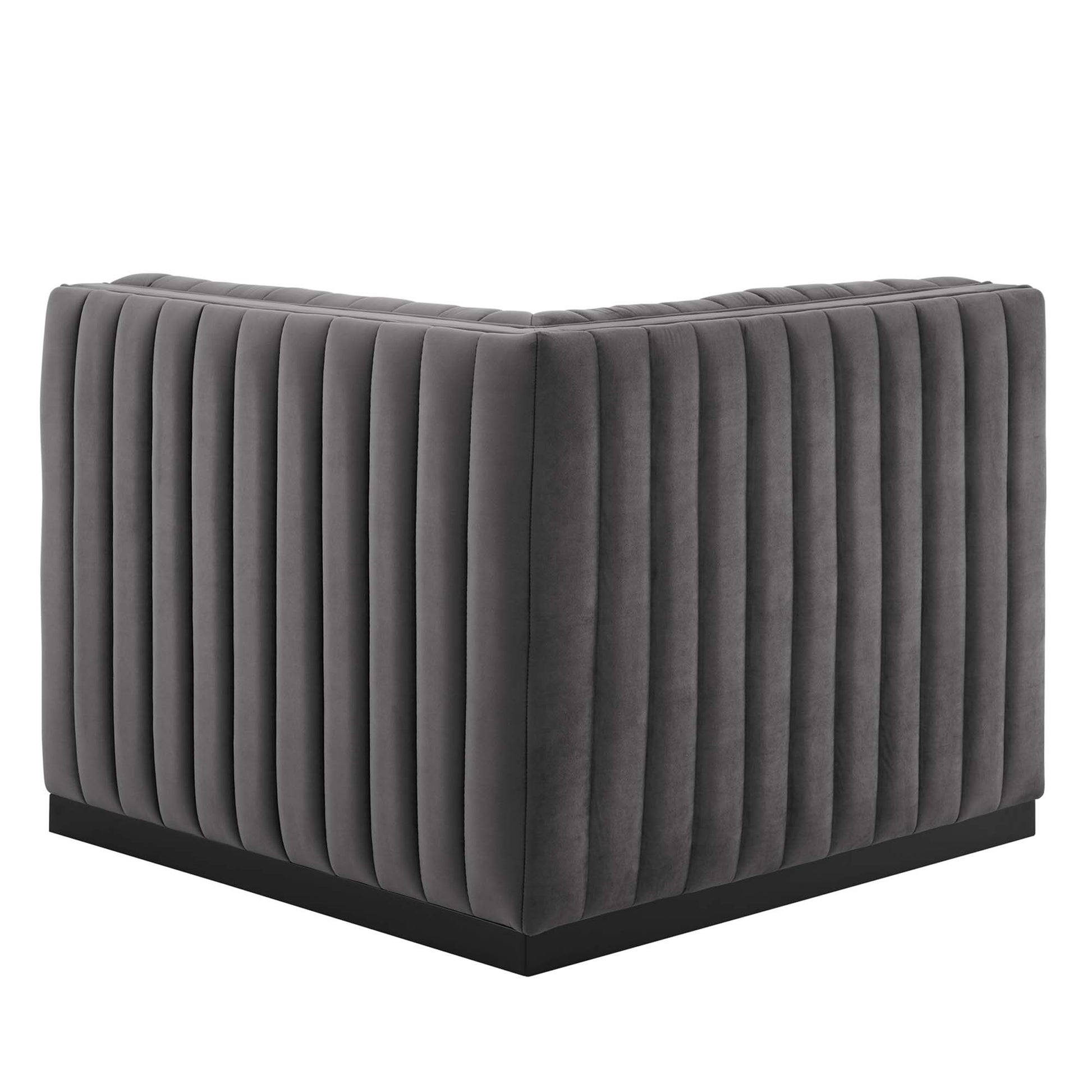 Modern appeal surrounds the Conjure Channel Tufted Performance Velvet Upholstered Right Corner Chair. Luxuriously soft, stain-resistant performance velvet upholstery covers dense foam padding and an individually wrapped spring coil system for a supportive living room chair that will become the go-to lounge spot for family and friends. Vertical channel tufting and subtle French piping adds depth to this vintage inspired sectional piece that effortlessly becomes the focal point in your living room. Solidly constructed from wood and plywood, this corner chair features non-marking foot caps and boasts a matte black base. Versatile and elegant, this sectional sofa piece is ideally suited for a variety of decor styles in your living room, lounge, or home office. Chair Weight Capacity: 331 lbs.
