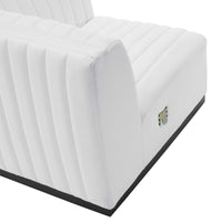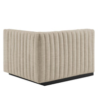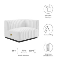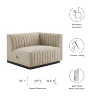 Modern appeal surrounds the Conjure Channel Tufted Upholstered Fabric Right-Arm Chair. Soft and durable fabric upholstery covers dense foam padding and an individually wrapped spring coil system for a supportive living room chair that will become the go-to lounge spot for family and friends. Vertical channel tufting and subtle French piping adds depth to this vintage inspired sectional piece that effortlessly becomes the focal point in your living room. Solidly constructed from wood and plywood, this armchair features non-marking foot caps and boasts a matte black base. Versatile and elegant, this sectional sofa piece is ideally suited for a variety of decor styles in your living room, lounge, or home office. Chair Weight Capacity: 331 lbs.