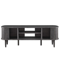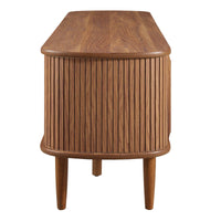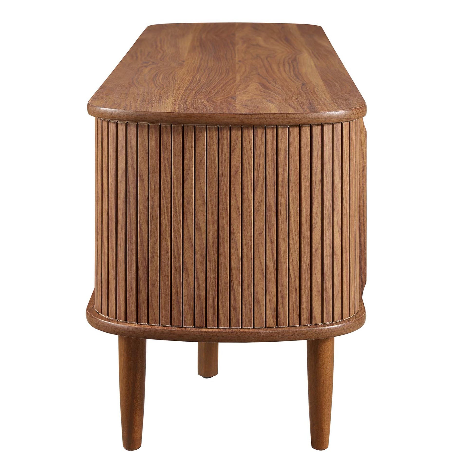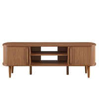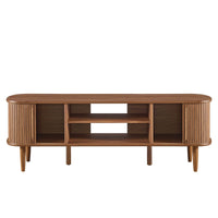 Invite mid-century aesthetics into your living space with the Contour 55" TV Stand. Contour features retro beadboard and an organic silhouette and stands on four tapered legs with two support legs. Crafted with rubberwood, MDF, and particleboard, this entertainment console is complete with a center storage area with an adjustable shelf and open back, as well as two side storage areas with sliding doors to conceal. This media stand accommodates TVs up to 60" and is the perfect modern addition to the living room, lounge area, or recreation room. Assembly required. Weight Capacity: 163 lbs.