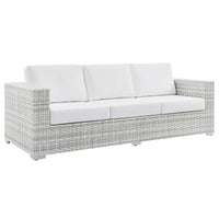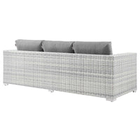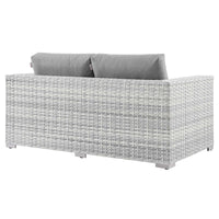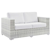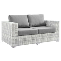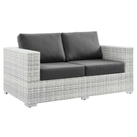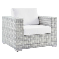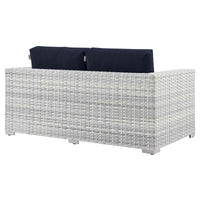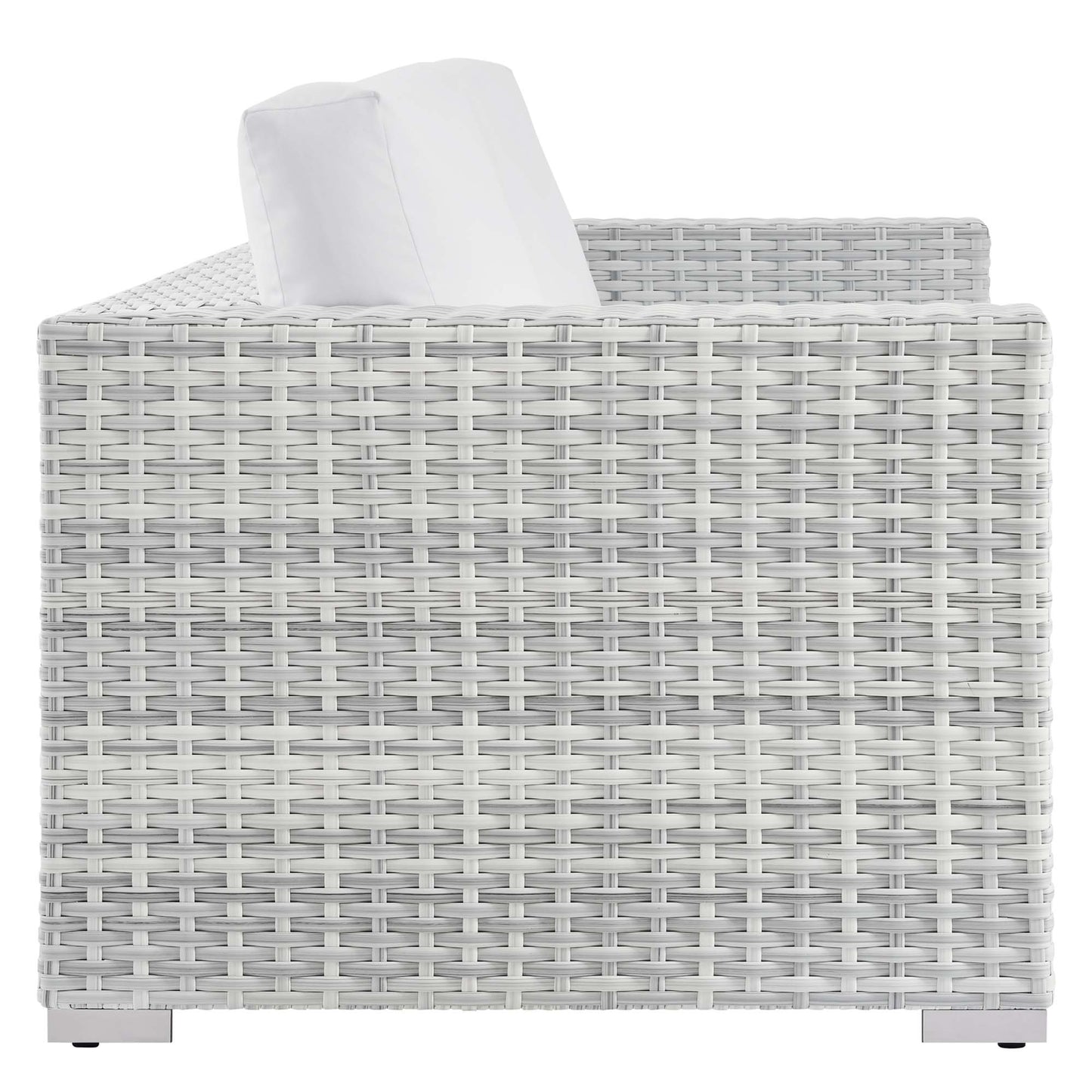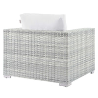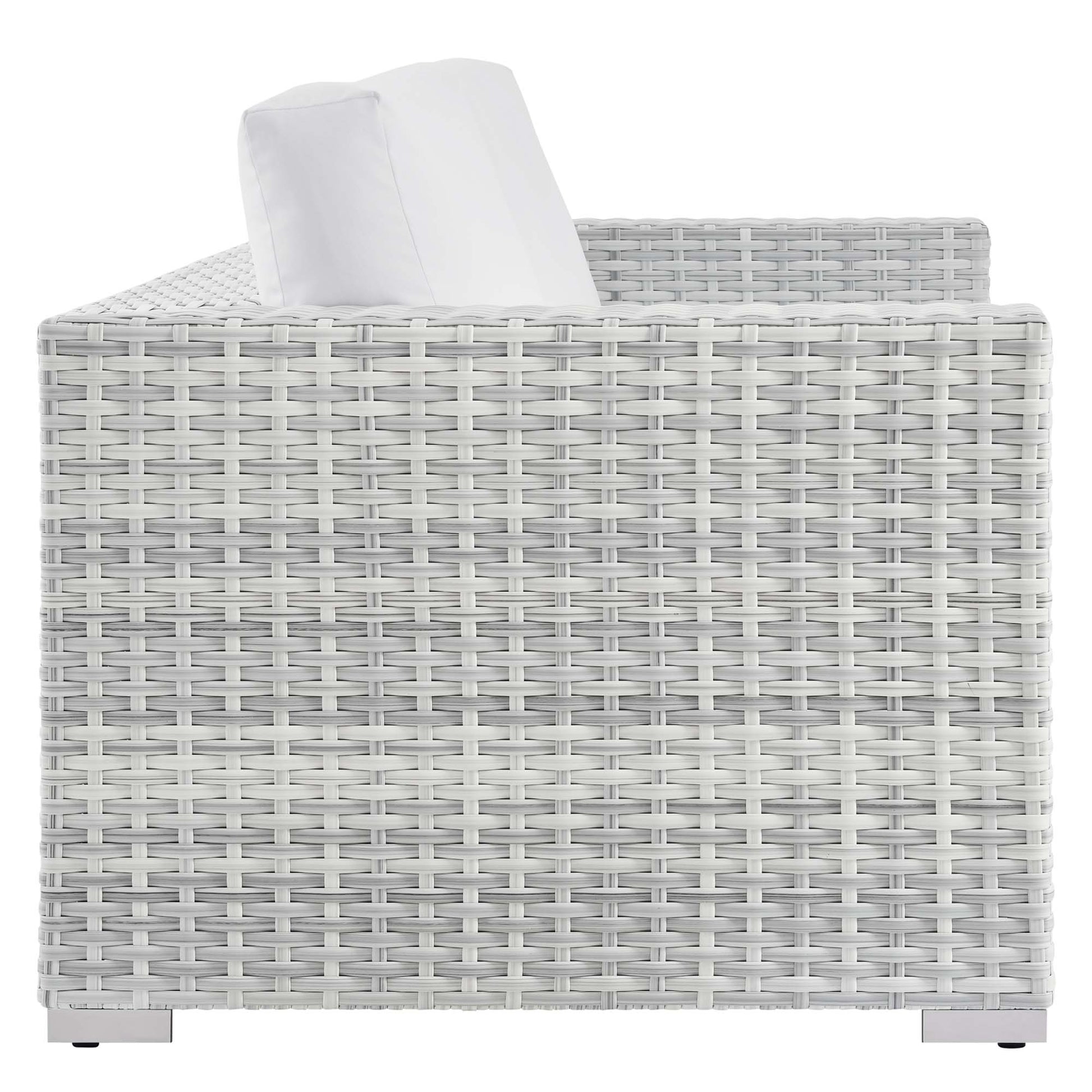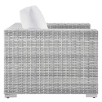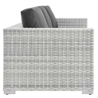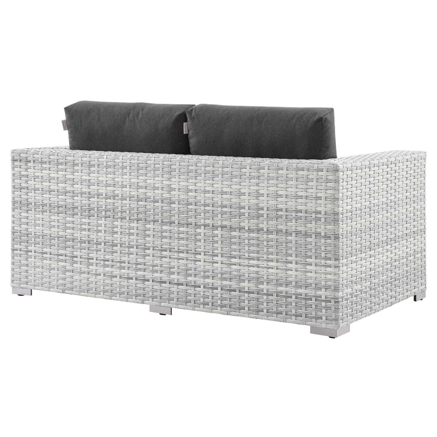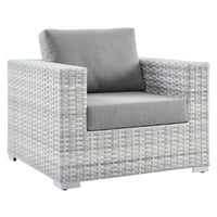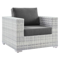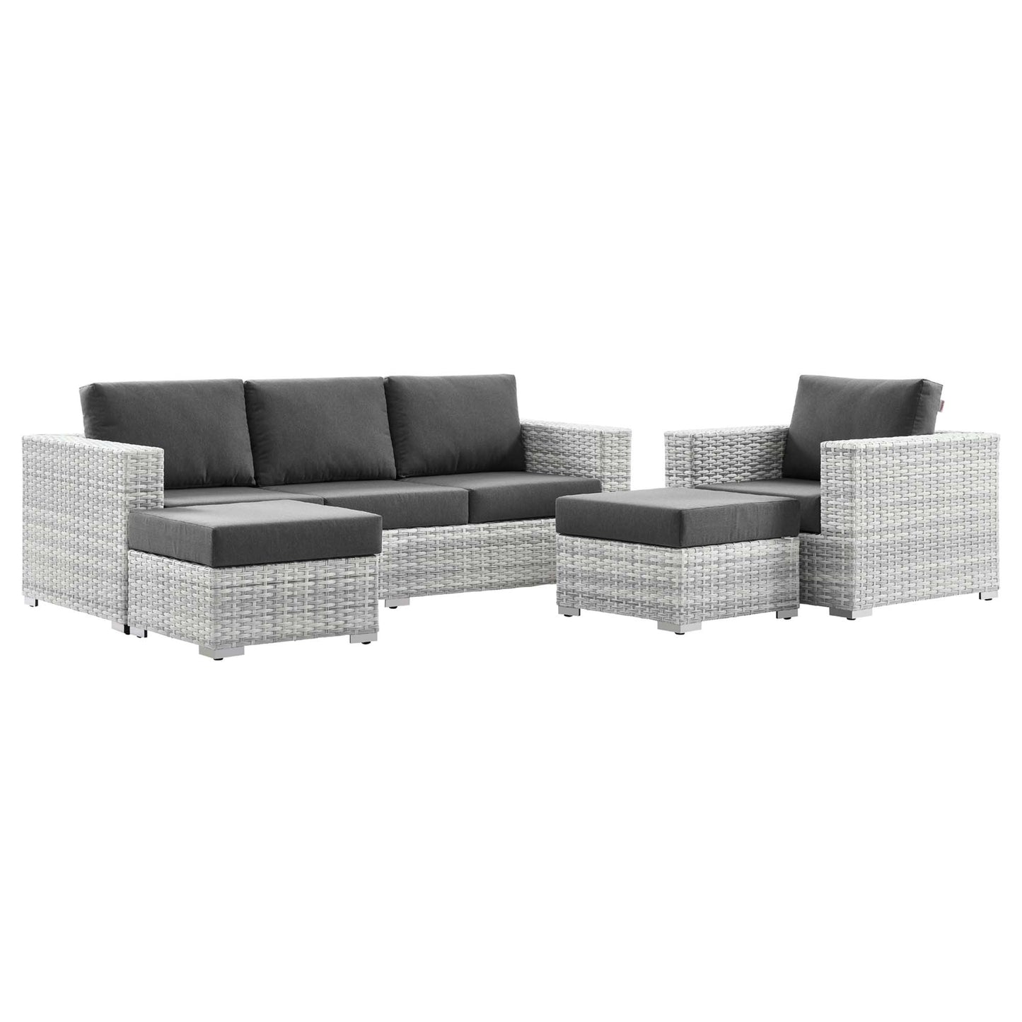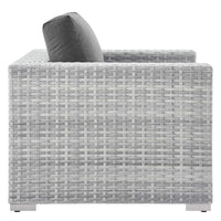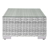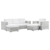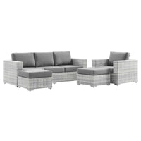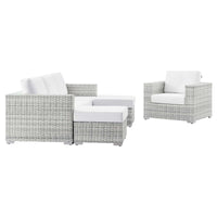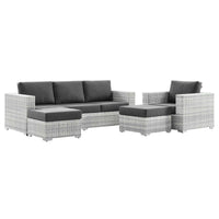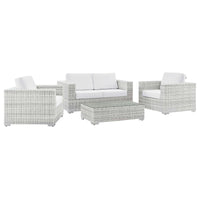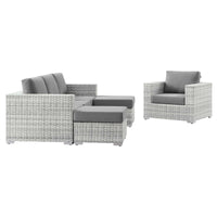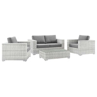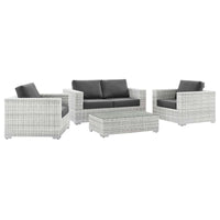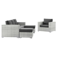 Gather stages of sensitivity with the Convene Outdoor Series. Made with a synthetic rattan weave and a powder-coated aluminum frame, Convene is a versatile outdoor furniture set that shifts and combines according to the spontaneous needs of the moment. Outfitted with all-weather fabric cushions, the Convene Sectional Set leaves a positive impression on friends and family while enhancing your patio, backyard, or poolside retreat with palpable distinction. This outdoor patio furniture set includes two armchairs, a loveseat, and a coffee table.