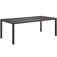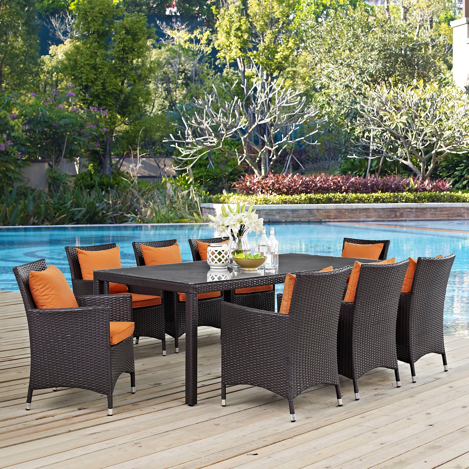 Gather stages of sensitivity with the Convene Outdoor Sectional series. Made with a synthetic rattan weave and a powder-coated aluminum frame, Convene is a versatile outdoor collection that shifts and combines according to the spontaneous needs of the moment. Outfitted with all-weather fabric cushions, leave a positive impression on friends and family while enhancing your patio, backyard, or poolside repast in this series of palpable distinction. This installment of the series is an Outdoor Patio Dining Set.