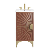 Bring refreshing energy into your bathroom space with the Daylight 18" Bathroom Vanity. Beautifully crafted with solid mango wood and a rich wood stain, this bathroom cabinet features a sun ray design made possible through intricate powder-coated brass details and hardware. This vanity cabinet is a complete addition to a bathroom with a ceramic sink basin and an integrated countertop with 8" centerset holes. Resting on a brass base with arched details and non-marking foot caps, this bathroom vanity offers ample storage space for bathroom essentials with the spacious open shelving. Fixtures not included. Assembly required.